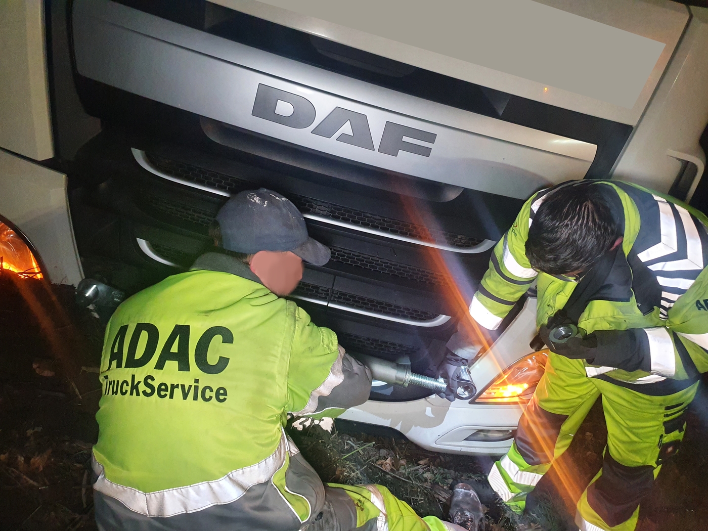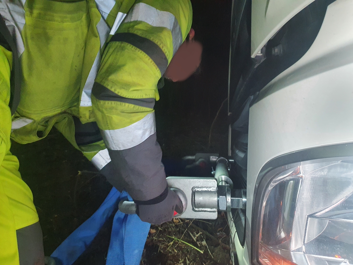 Fachkräfte für Schwerlastbergung rückten an, um den Sattelzug auf die Straße zurückzubringen. Sie montierten Abschleppvorrichtungen an der Zugmaschine und schwenkten diese mit der Winde eines schweren Bergefahrzeuges behutsam auf den Asphalt.