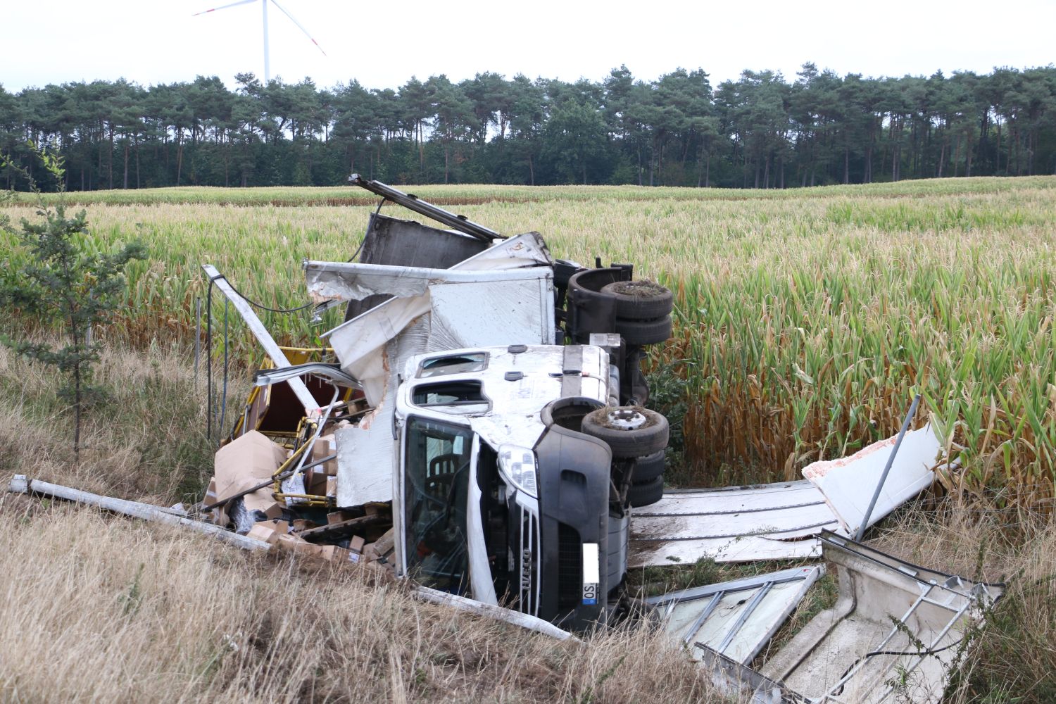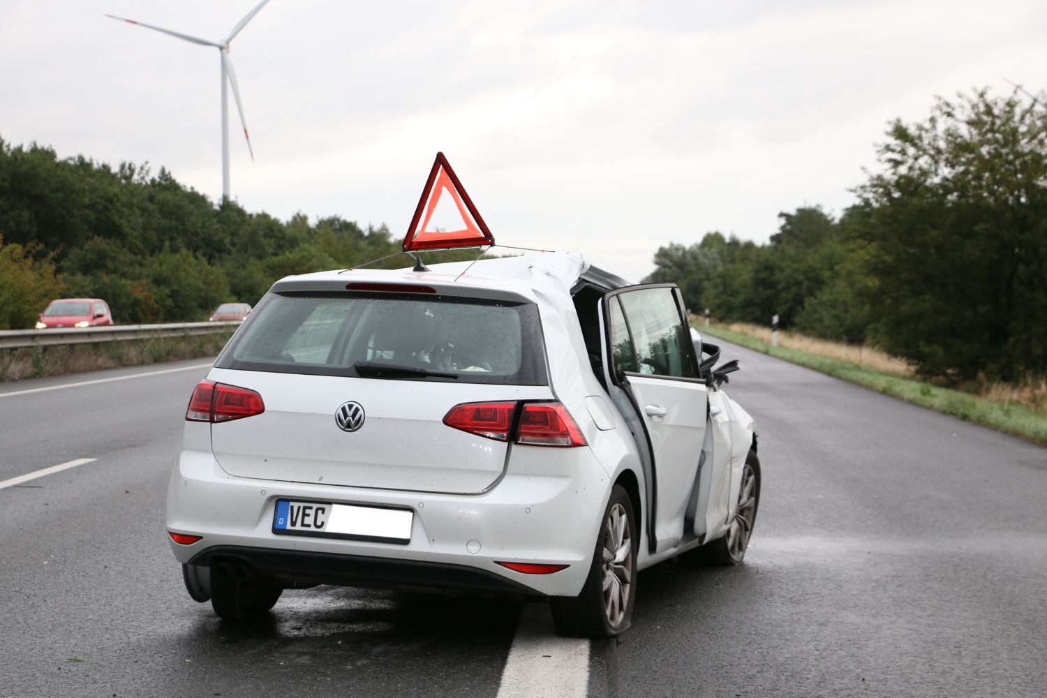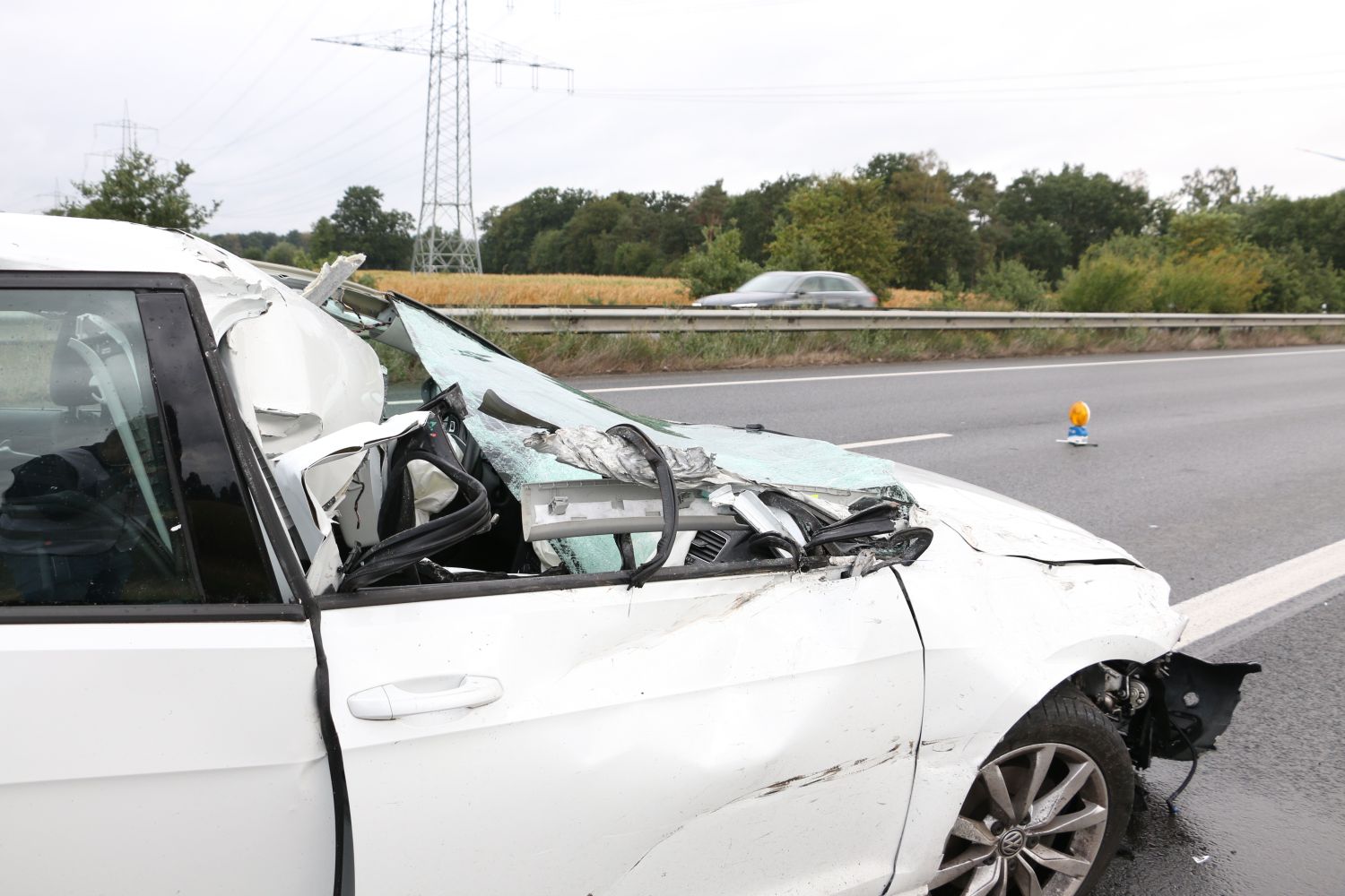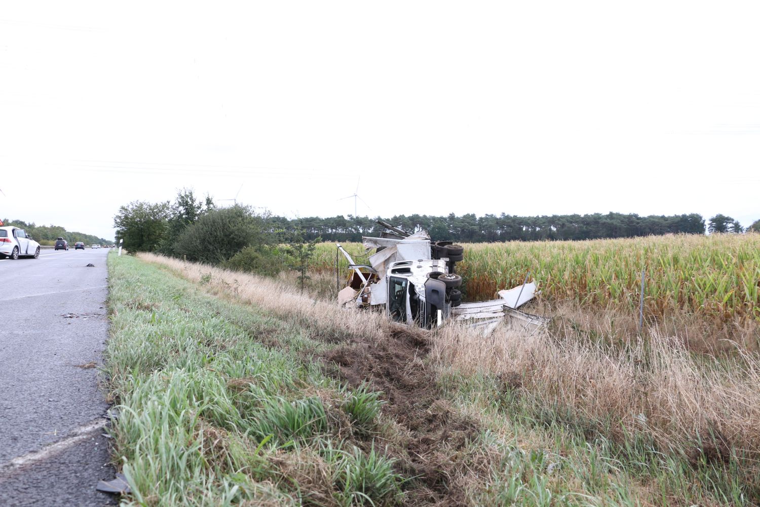 Als der Transporter mit Auflieger dort die rechte Spur befuhr, fuhr ihm vom linken Fahrstreifen aus ein PKW seitlich im Bereich der Hinterachse auf. Dadurch kam der LKW von der Fahrbahn ab und im rechten Grünstreifen ins Schleudern. Entgegen der Fahrtrichtung kam er dann im Graben zum Liegen.