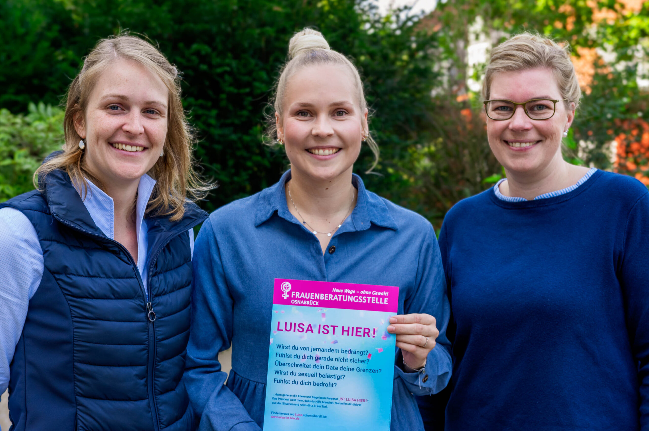 „Luisa“ ist ein Hilfsangebot für Frauen, die aus einer unangenehmen Situation heraus möchten. Mit der Frage „Ist Luisa hier?“ können sich Frauen ans Personal wenden und bekommen unmittelbar und diskret Hilfe. Die Frau entscheidet dabei selbst, welche Hilfemöglichkeit sie in Anspruch nehmen möchte – beispielsweise ob für sie ein Taxi oder eine Freundin gerufen werden soll.