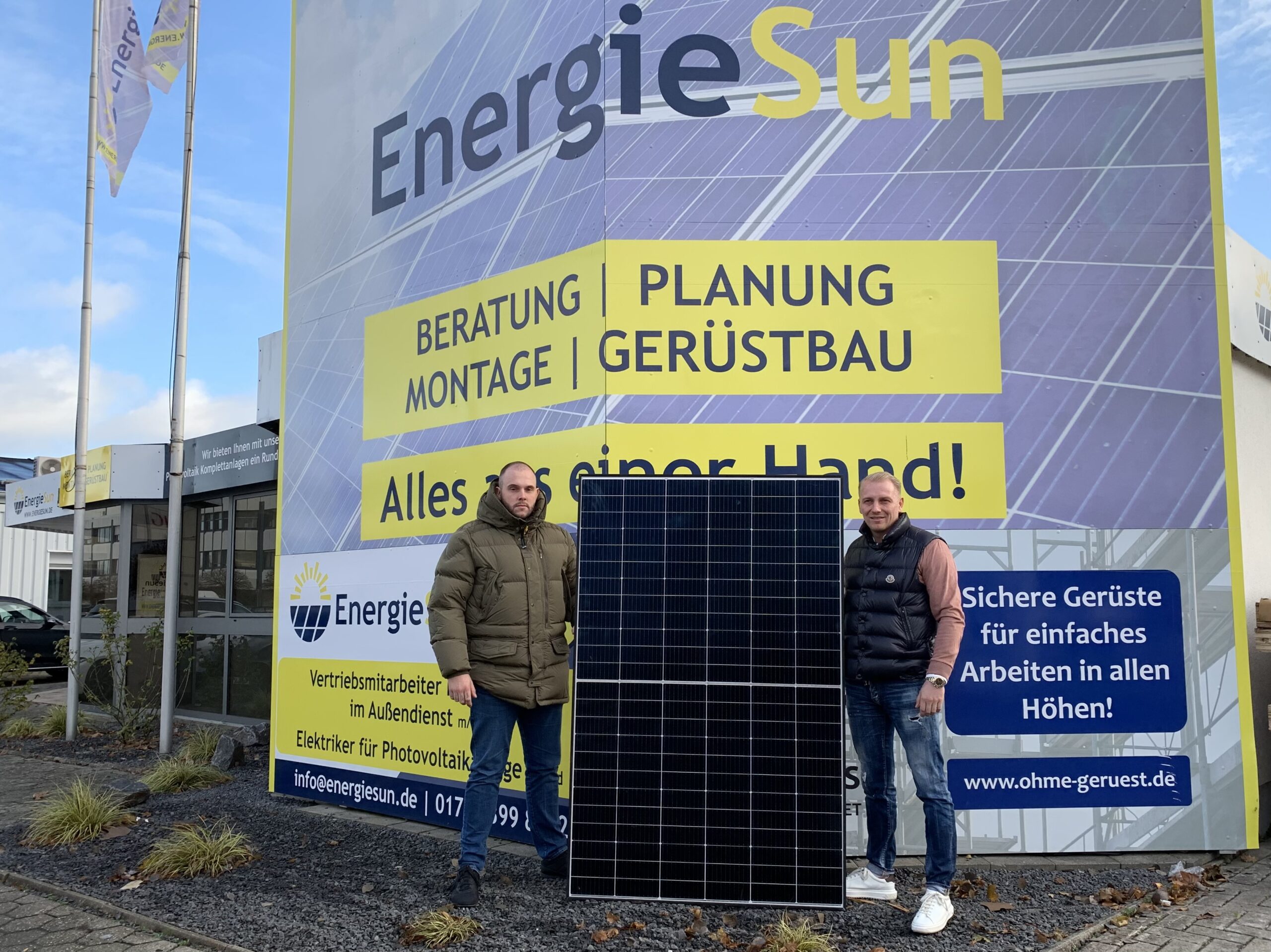 Rene Ohme (links) und Yannick Persson vor dem EnergieSun-Gebäude am Hettlicher Masch / Foto: Guss