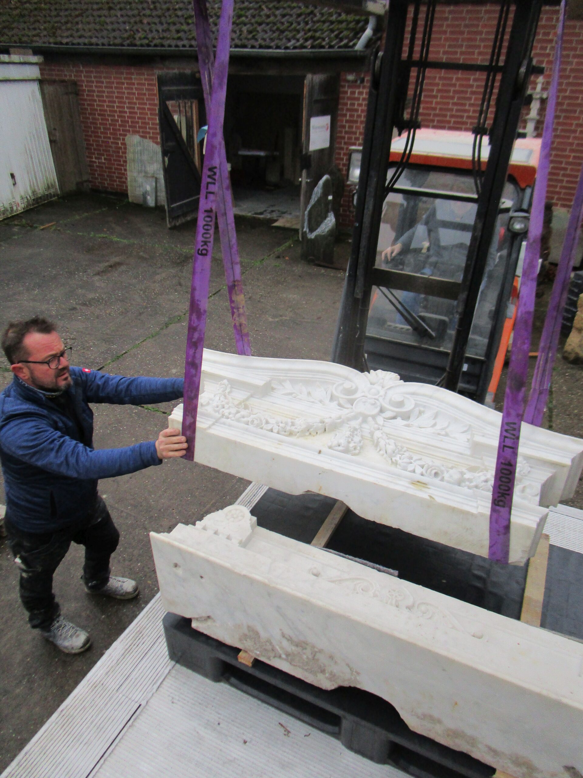 Verladen der historisch wertvollen Werkstücke aus Marmor in der Steinmetzwerkstatt der Firma Wennemer. / Foto: Museumsquartier Osnabrück (Thorsten Heese)