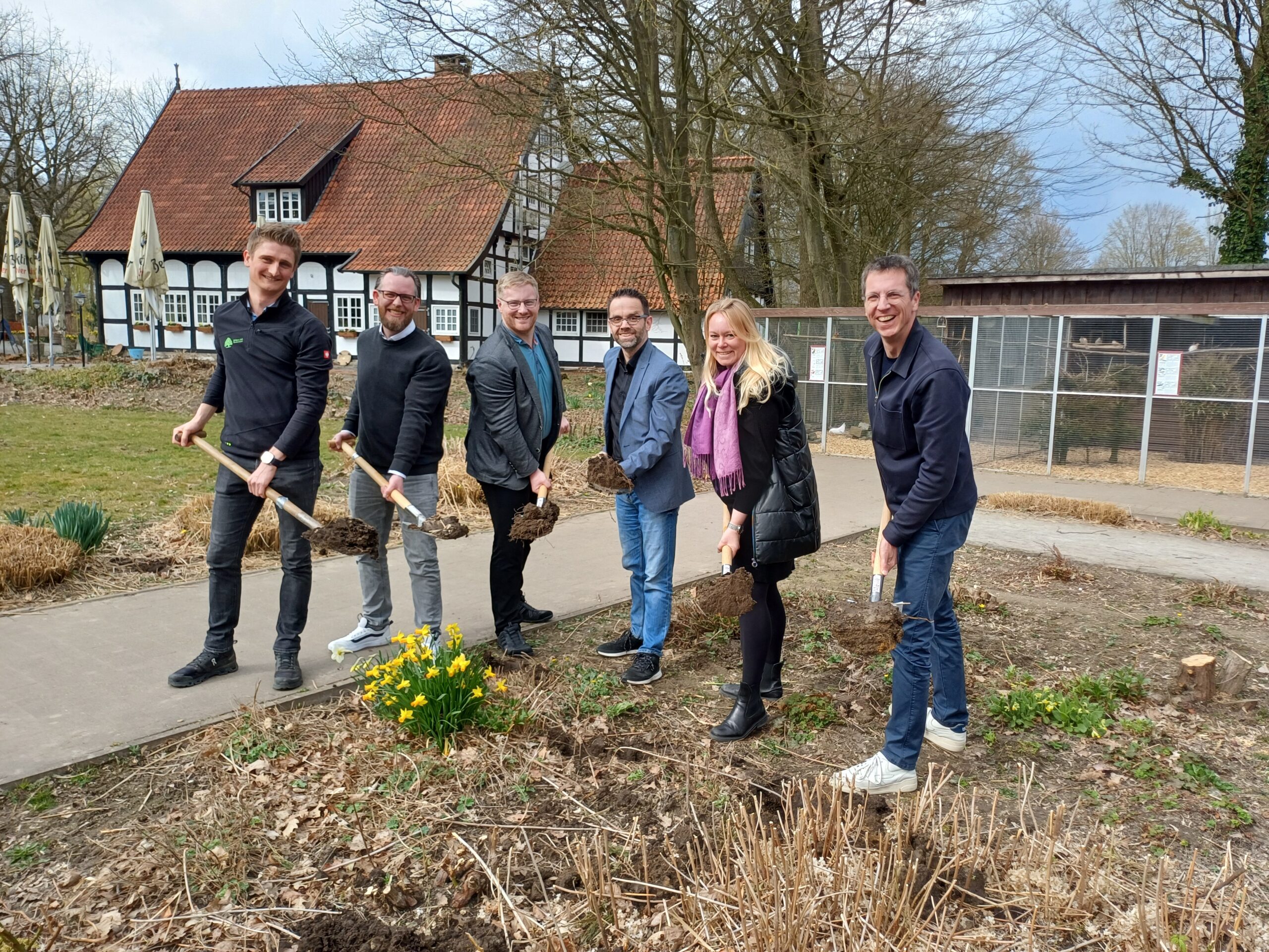 Der offizielle Auftakt lief nach Maß: Mit dem symbolischen Ersten Spatenstich haben Bürgermeisterin Jutta Dettmann, Ortsbürgermeister Uwe Plaß, Stadtbaurat Florian Schmeing, der Leiter des Amtes für Umwelt und Klimaschutz, Thilo Richter, Nils Kortemeier vom Planungsbüro Kortemeier Brokmann Landschaftsarchitekten GmbH und Steffen Redemann, Geschäftsführer des bauausführenden Unternehmens Volbers & Redemann GmbH & Co. KG Garten und Landschaftsbau, den Starschuss zur Umgestaltung des Grönenbergparks in Melle-Mitte im Zuge des Projektes „Stadt, Land, Fluss – Erlebnis und Erholung entlang der Else“ abgegeben. Die Gesamtkosten für das Vorhaben belaufen sich auf fast 3,8 Millionen Euro. 3 Millionen Euro stammen dabei aus Fördergeldern des Bundesministeriums für Wohnen, Stadtentwicklung und Bauwesen.