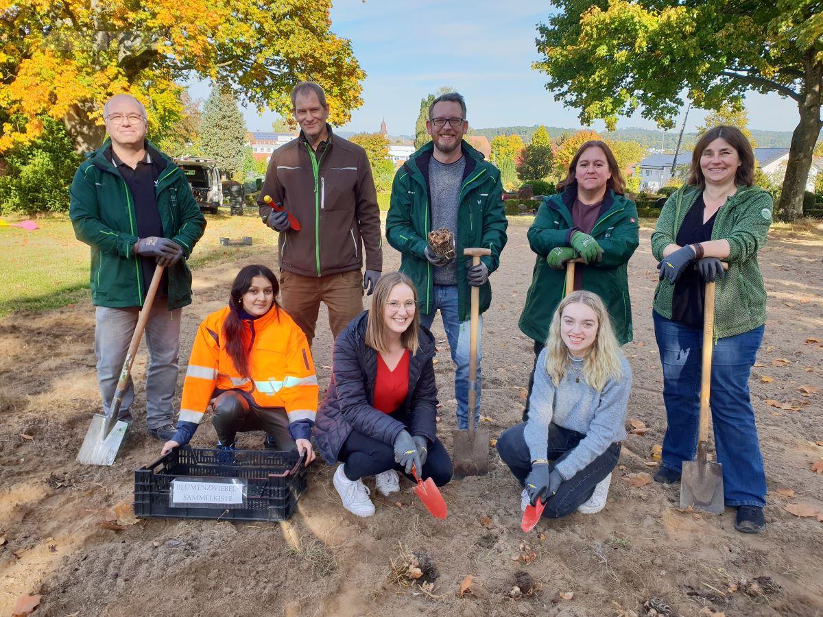 Im Rahmen des Blumenzwiebel-Recycling-Projektes pflanzte der Imkerverein, das Umweltbüro und die städtischen Nachwuchskräften auf dem Friedhof in Melle-Mitte rund 2.000 Blumenzwiebeln. Damit soll der Friedhof bunter gestaltet und der Bestand von Insekten geschützt werden.