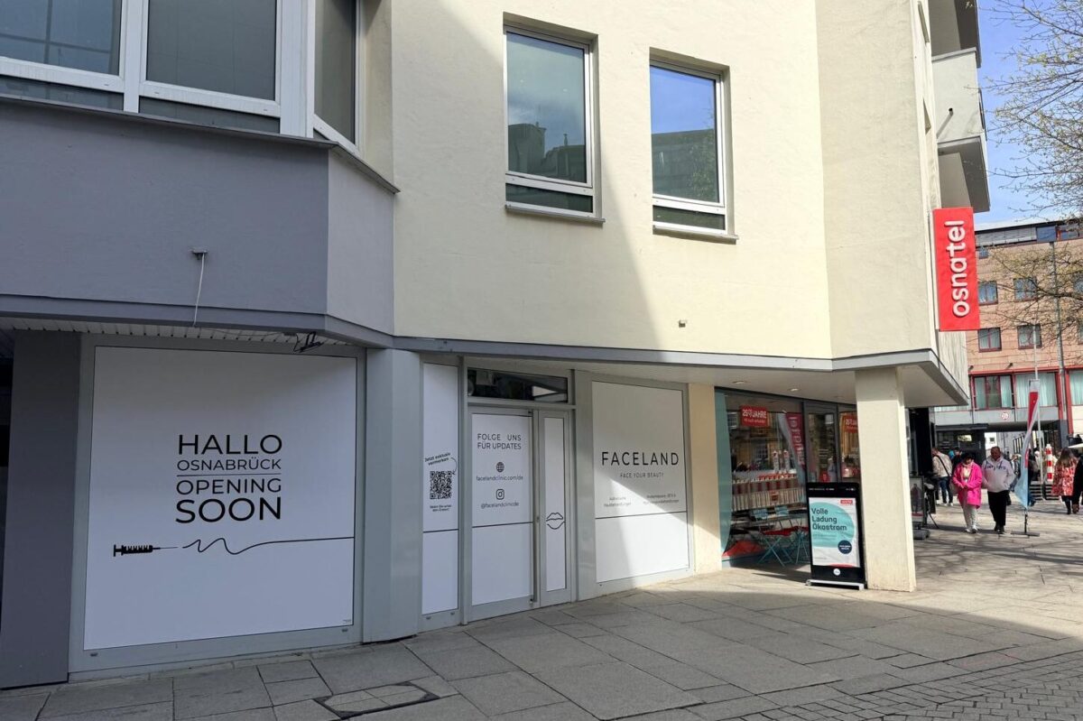 Damit kommt eine Arztpraxis für Schönheitseingriffe, Hautbehandlungen und Behandlungen mit Muskelrelaxans und Fillern mitten in die Innenstadt von Osnabrück. In Deutschland ist Faceland bereits in Bonn Dortmund, Duisburg, Düsseldorf, Essen, Köln und Münster vertreten. Außerdem gibt es Standorte in Italien, den Niederlanden, Belgien und der Schweiz.
