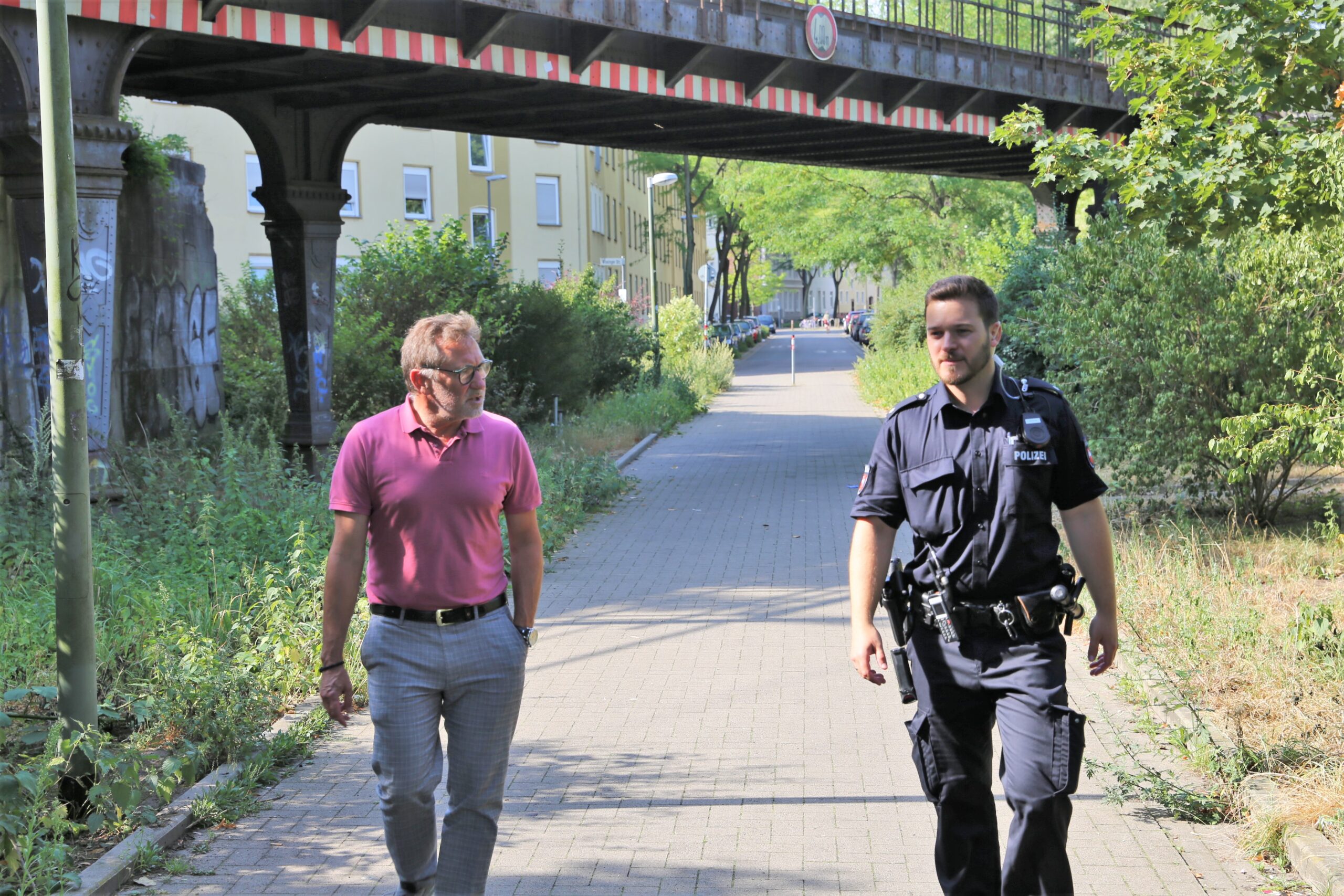 Seit Anfang Februar versieht Markus Bienias von der Polizeiinspektion Osnabrück seinen Dienst als Kontaktbeamter (KOB) im Osnabrücker Stadtteil Schinkel. Der 30-jährige Polizeikommissar ist der erste Stadtteil-Polizist, der diese neue Art der Polizeiarbeit im Rahmen eines Projekts ausübt. Am Donnerstag, den 13. August 2020, verschaffte sich Polizeipräsident Michael Maßmann vor Ort einen Eindruck von der Arbeit und ging mit ihm im Viertel auf Streife.