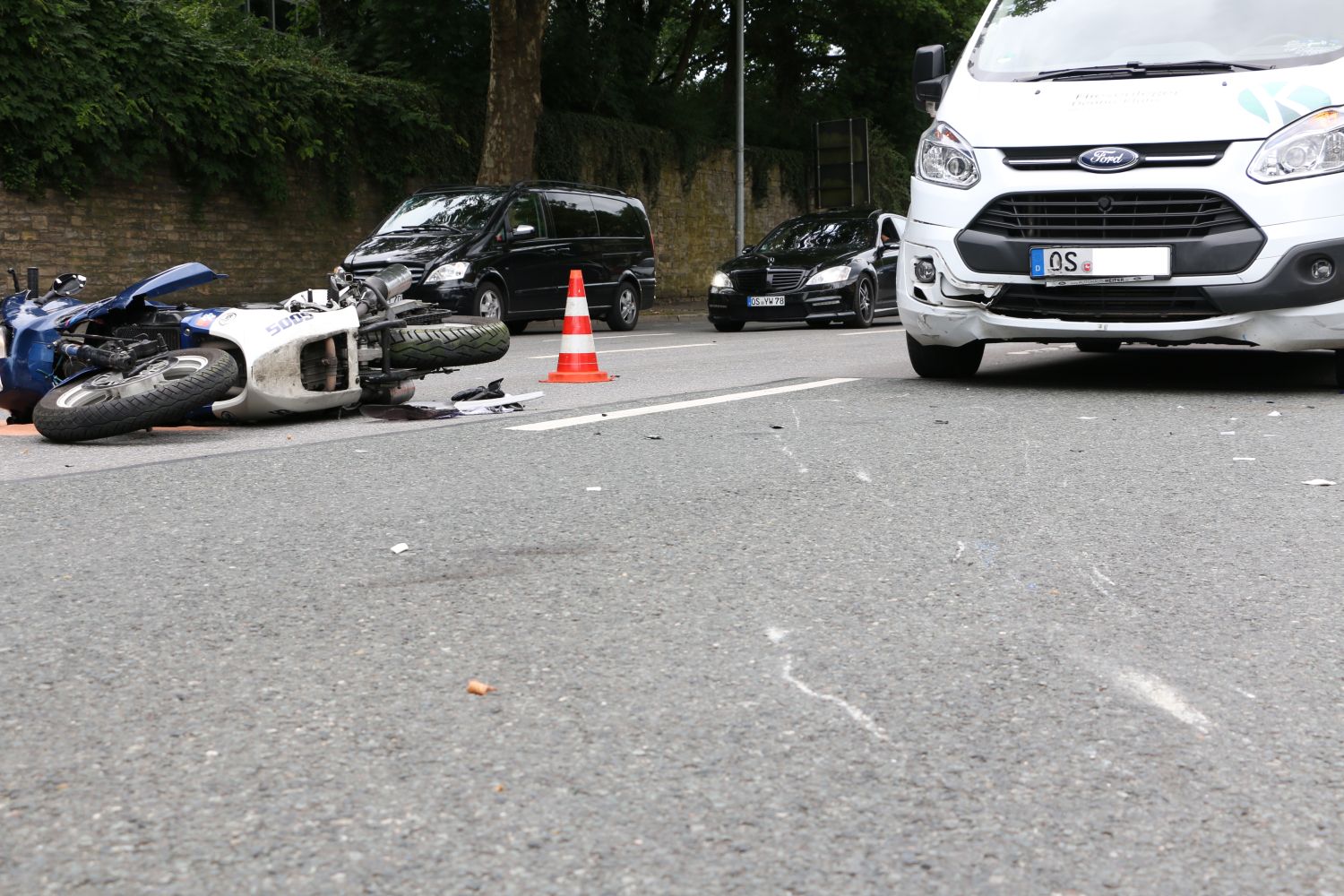 Der Kradfahrer wurde zwar durch den Crash verletzt, war jedoch ansprechbar. Nach notärztlicher Versorgung wurde er vom Rettungsdienst in ein Osnabrücker Krankenhaus gebracht. Am Motorrad entstand großer Schaden, der Transporter wurde lediglich im Bereich der Stoßstange beschädigt.