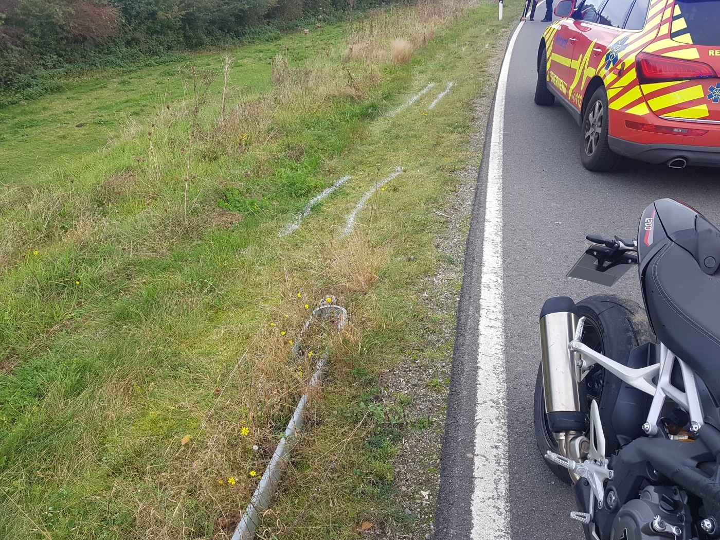 Er fuhr über den Grünstreifen und das Motorrad rutschte dann hinter der Leitplanke am Abgrund zu einer Kuhweide entlang. Der 51-jährige Kradfahrer stürzte und wurde nach erster Einschätzung der Einsatzkräfte schwer verletzt. Die Besatzung eines Rettungswagens und ein Notarzt versorgten ihn vor Ort, bevor sie ihn in ein Krankenhaus brachten.