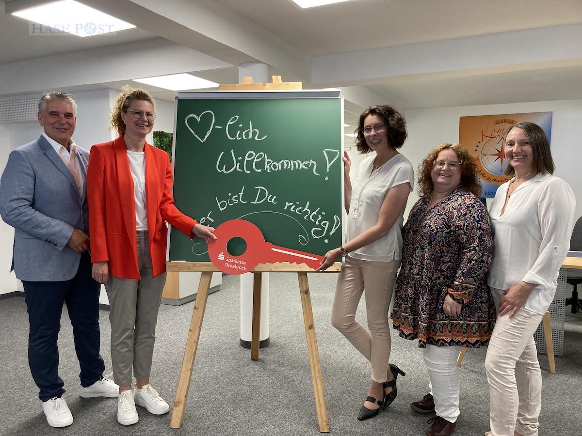 Symbolische Schlüsselübergabe von (von links) Christian Labude und Birgit Liedmeier an das Schulkompass-Team mit Sabine Soetebeer, Nicole Meyer und Gaby Hahn. / Foto: Schulte