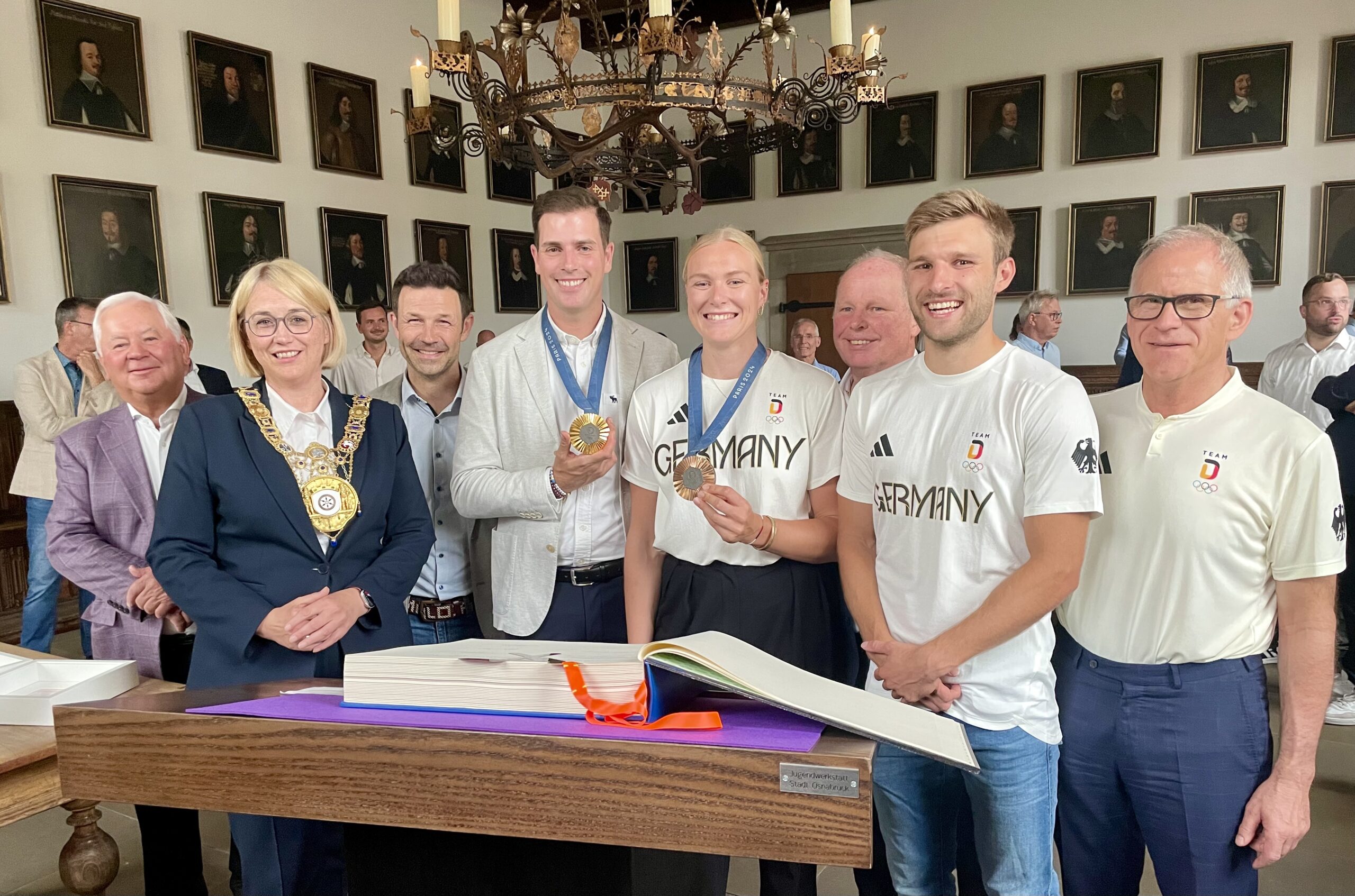 Im historischen Friedenssaal des Osnabrücker Rathauses drehte sich am Freitagnachmittag, den 6. September, noch einmal alles um die Olympischen Spiele 2024 in Paris: Die Medaillengewinnerinnen und -gewinner, darunter Pia Greiten (Rudern) und der Frederic Wandres (Reiten), trugen sich ebenso ins Goldene Buch der Stadt Osnabrück ein wie der Olympionike Fabian Dammermann (Leichtathletik) und sein Trainer Anton Siemer. Die Mannschaftsärzte Professor Martin Engelhardt und Dr. Casper Grim vom Klinikum Osnabrück komplettierten das olympische Sextett.
