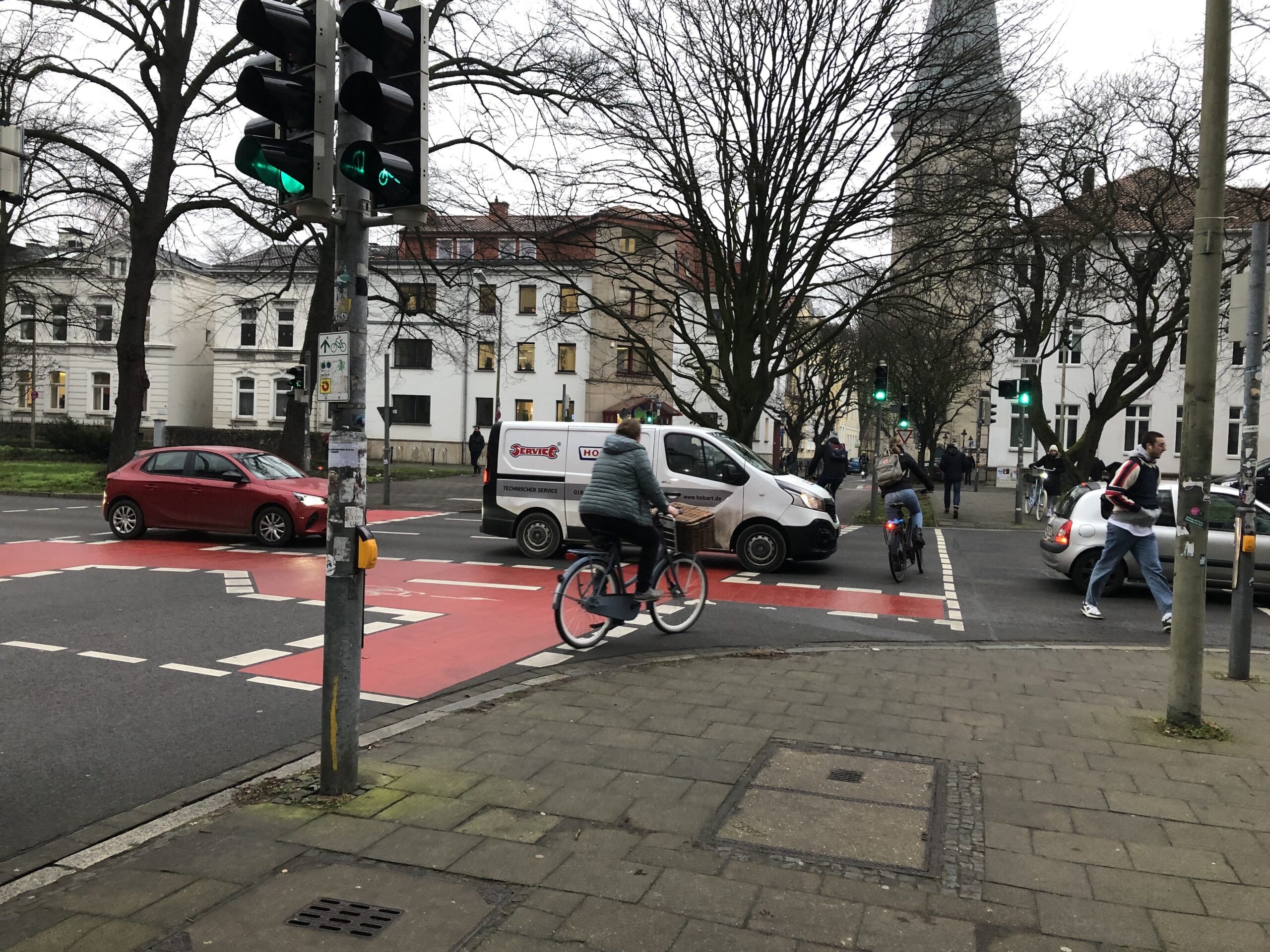 Durch die nicht mehr vorhandene Rechtsabbiegespur zur Martinistraße bilde sich ein Rückstau, sodass KFZ-Fahrer mit ihren Fahrzeugen auf den rotmarkierten Radwegen und Fußgängerfurten des Heger-Tor-Walls verkehrsbedingt zum Stehen kämen. Dadurch würden querende Fahrradfahrer und Fußgänger gehindert den Wall problemlos zu passieren.