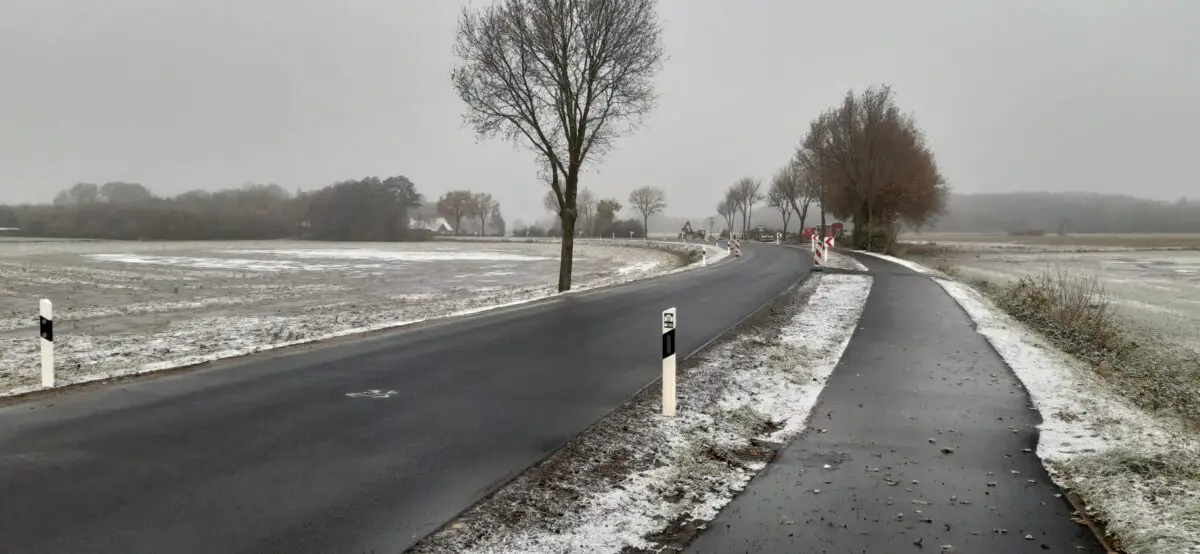 Aufgrund der kalten und nassen Temperaturen kann es in den letzten Tagen der Arbeiten zu einer leichten Verzögerung des Abschlusses kommen. Die noch fehlende Markierung wird dann im Frühjahr des nächsten Jahres aufgebracht. In Absprache mit dem Landkreis wird die K138 bis dahin von der Verkehrsbehörde der Samtgemeinde Bersenbrück mit der Beschilderung „Tempo 50″ sowie „Fahrbahnmarkierung fehlt“ ausgeschildert.