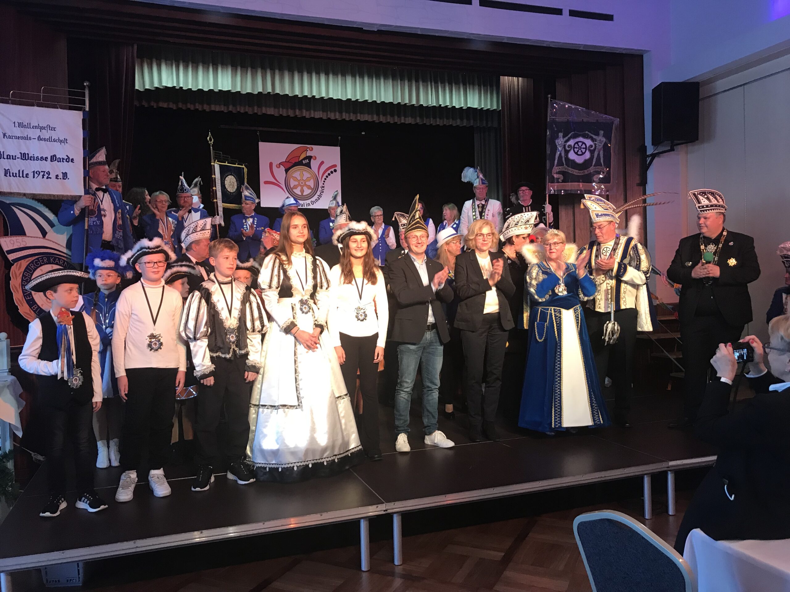 Das Stadtprinzenpaar und Gefolge gemeinsam mit Bürgermeisterin Eva-Maria Westermann auf der Bühne des Gasthaus Thies / Foto: Burrichter