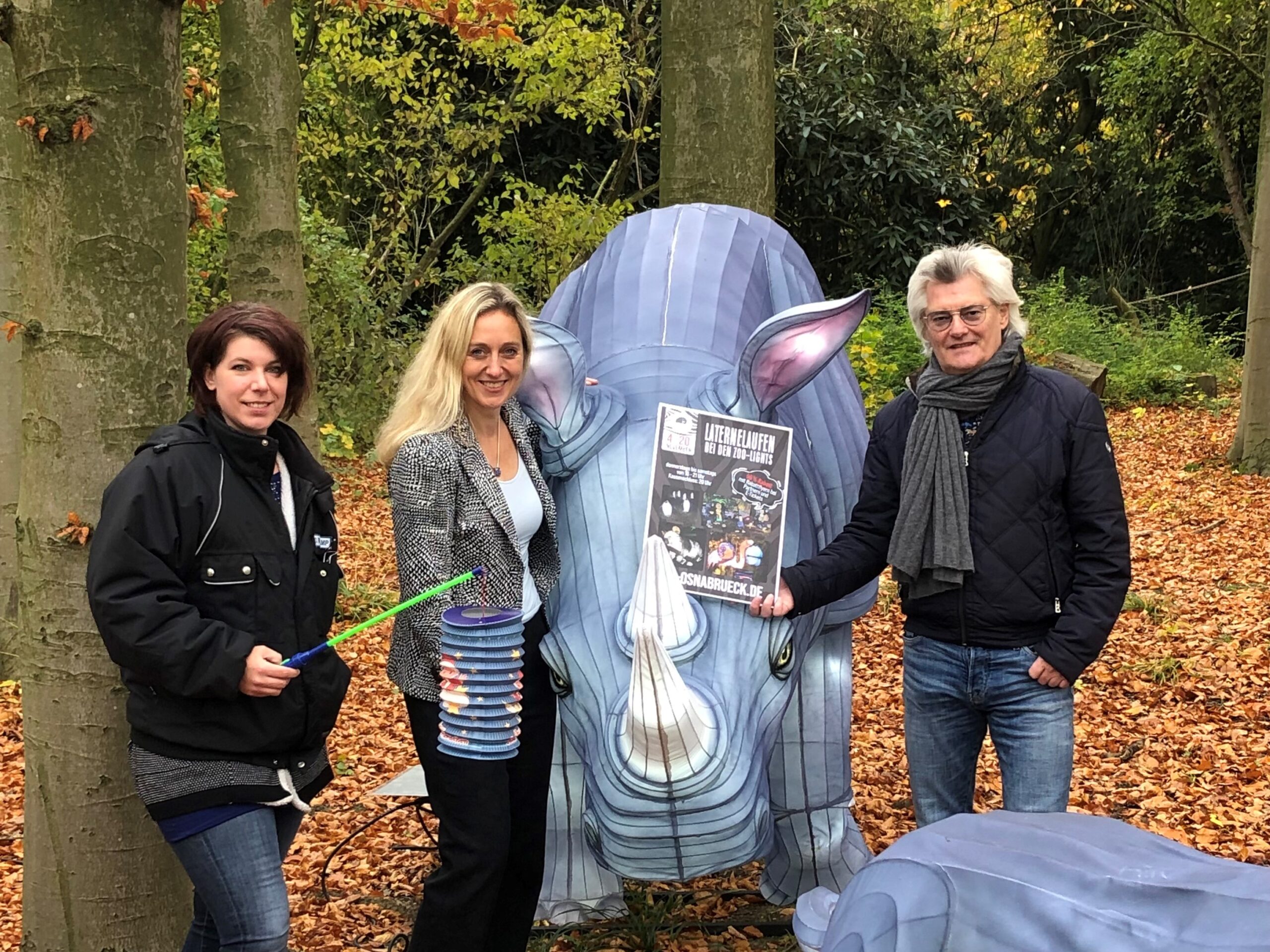 Am 4. November beginnen die „Zoo-Lights” im Zoo Osnabrück. Neu dabei ist in diesem Jahr eine große Nashornfamilie, die im dunklen Zoo schimmert. Diana Reuvekamp (v.l.n.r.), Veranstaltungskauffrau im Zoo Osnabrück, Nancy Plaßmann, Vorständin der Sparkasse Osnabrück und Andreas Busemann, Geschäftsführer des Zoo Osnabrück sind von den neuen Figuren bereits begeistert.