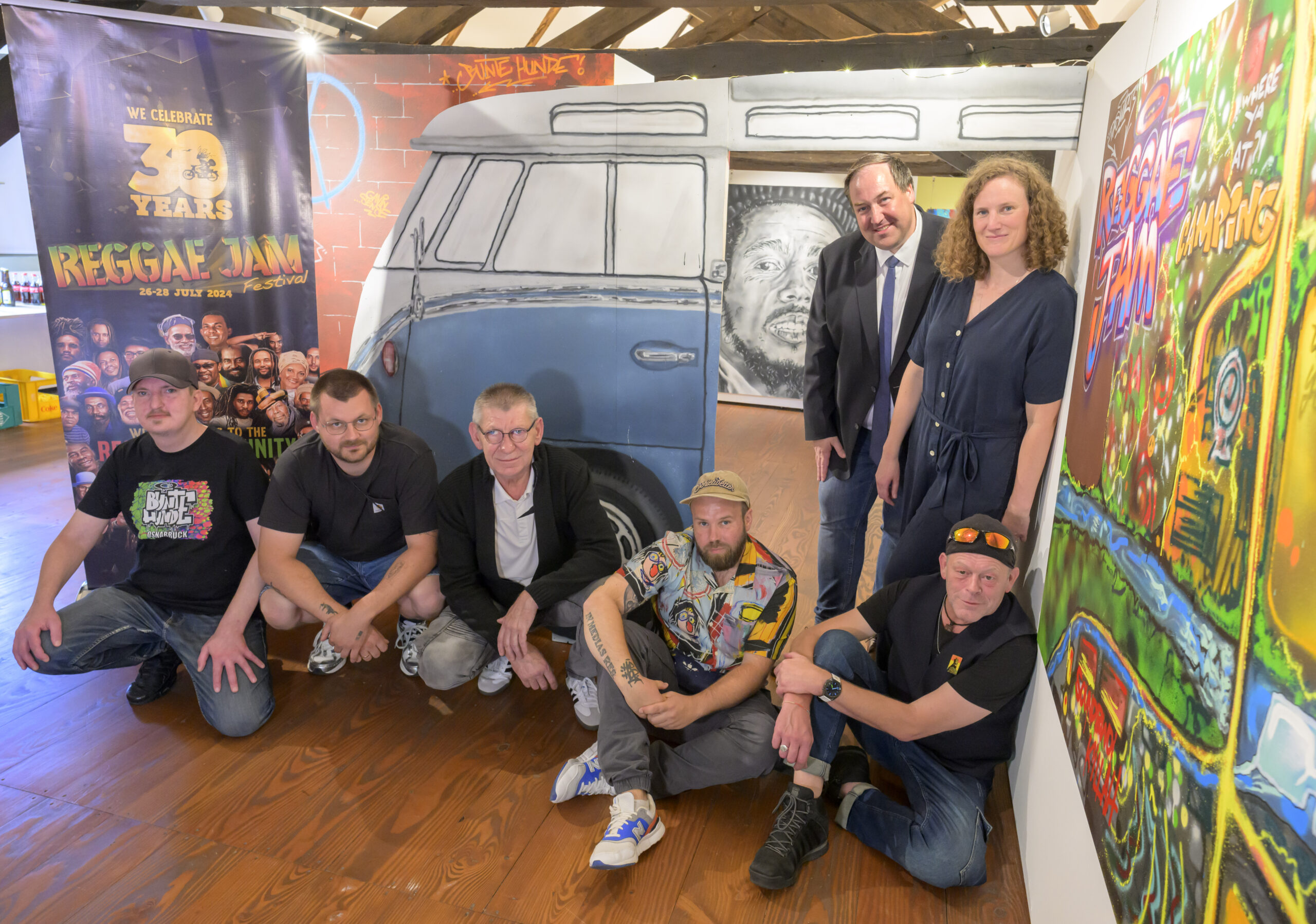 Bildunterschrift zum Titelbild: Bunt und kreativ präsentieren die „Bunten Hunde“ das Thema 30 Jahre Reggae Jam im Museum im Kloster. Sitzend von links: Max „Optick“ Fuhrmann und Alexander „Miaskoh“ Cordes (beide Bunte Hunde), Bernard Wolinski (Museum im Kloster), Christian „Das Wort“ Aretz (Bunte Hunde) und Reggae-Jam-Gründer Bernd „Sheriff“ Lagemann; stehend: Kreistagsabgeordneter Jörg Brüwer und Museumsleiterin Katharina Pfaff. Es fehlt das Bunte-Hunde-Mitglied Marcel „Senf“ Ostendorf.
