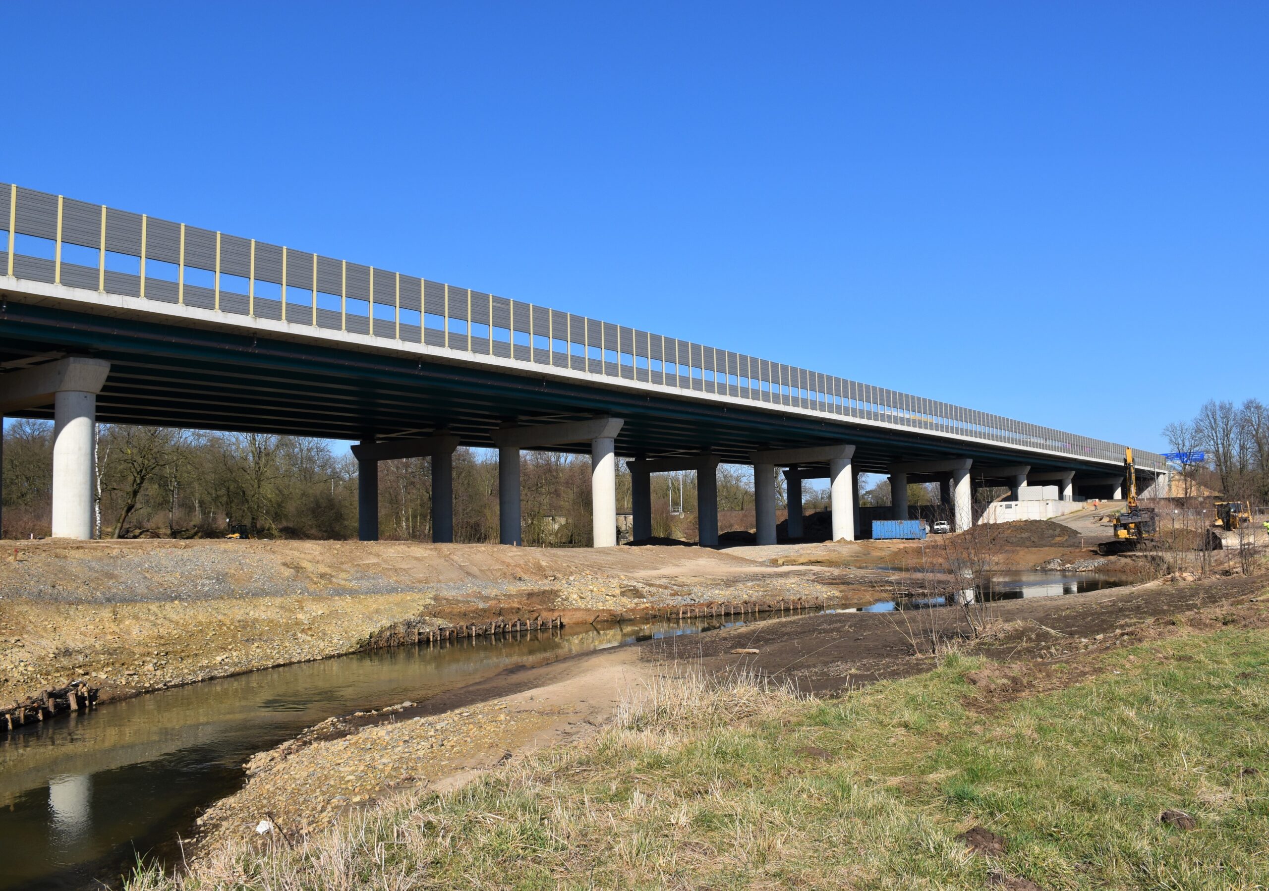 Der Bachverlauf der Düte lief zuvor diagonal unter der Brücke. „Jetzt schlängelt sich die Düte, angelegt mit Flachuferzonen, in Schleifen unter der Brücke hindurch. Die Uferbereiche sowie die oberen angrenzenden Flächen werden im Sommer mit regionalen Saatgutmischungen angesät“, so Rex. Im Herbst pflanzen die Landespfleger Strauchhecken und befestigen Uferböschungen mit Erlen und Weiden. Die Böschungsflächen im Bereich der Brückenwiderlager werden ebenfalls bepflanzt.