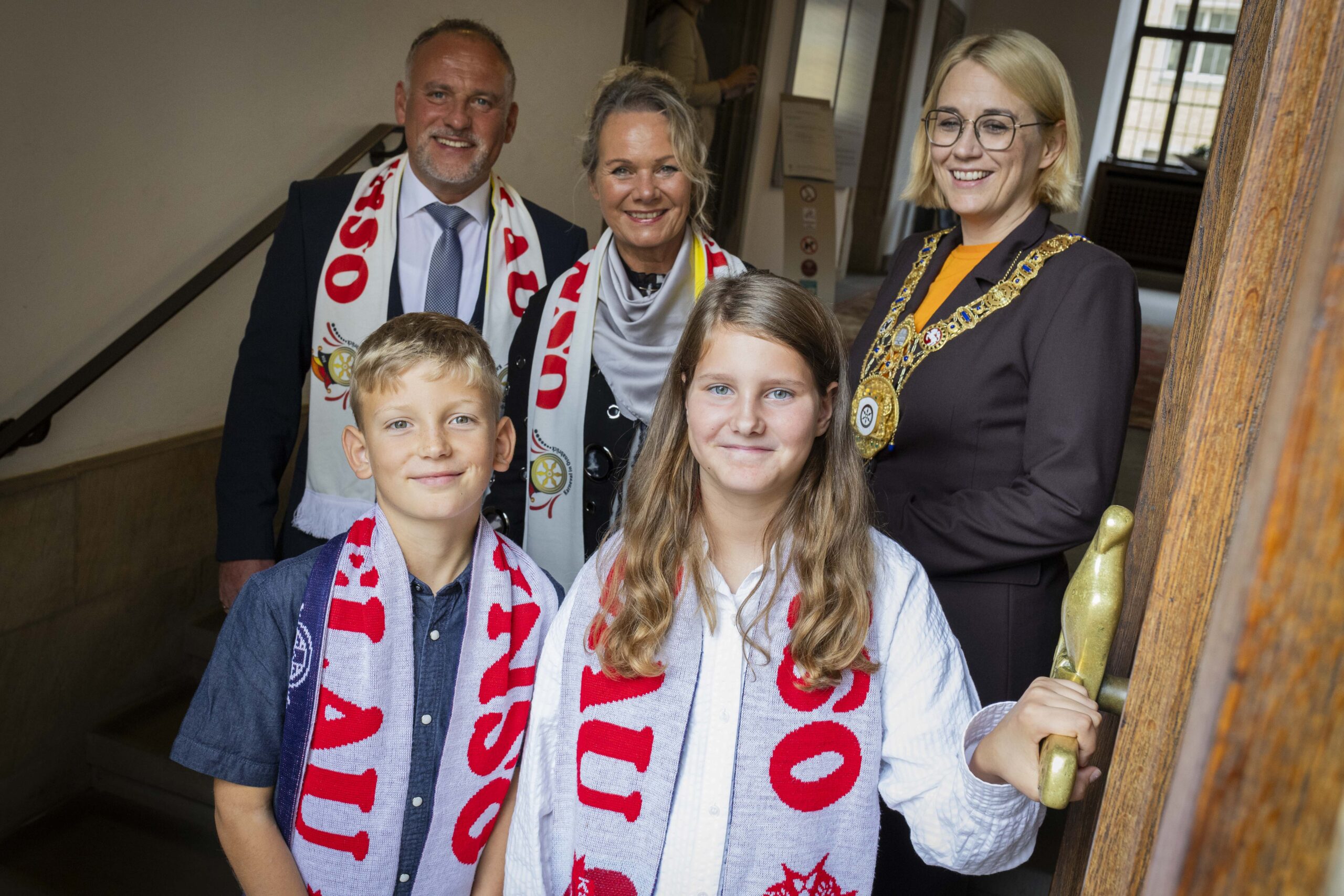 Neben den großen Majestäten sorgte auch das Kinderprinzenpaar für Begeisterung. Die elfjährigen Mia und Nico, die beide die sechste Klasse der Ludwig-Windhorst-Schule in Ostercappeln besuchen, stehen vor ihrer ersten Karnevalssession als Nachwuchs-Regenten. Sichtlich aufgeregt, aber voller Vorfreude nahmen sie von Oberbürgermeisterin Pötter ein kleines Geschenk entgegen, begleitet von aufmunternden Worten: „Ich wünsche euch eine tolle Zeit und vor allem viel Spaß – insbesondere beim Ossensamstag, dem Höhepunkt des Osnabrücker Karnevals.“