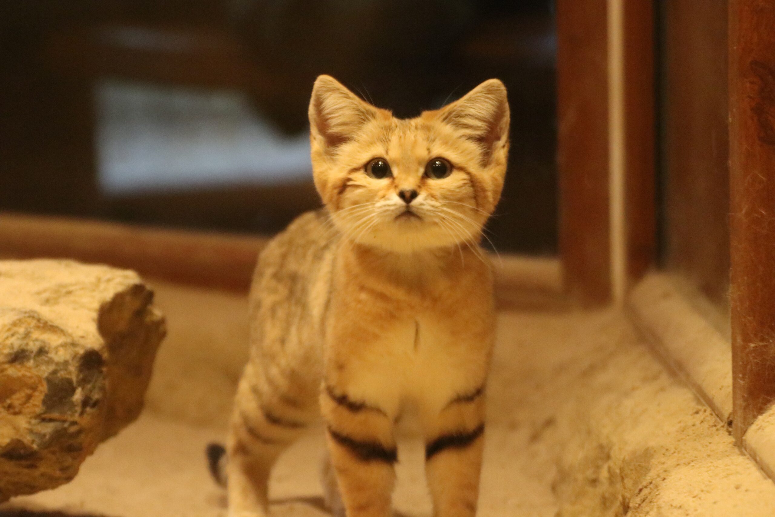 Nach der Empfehlung des Zuchtbuches sind im November die männliche Sandkatze Stitch aus dem Zoo Danzig und die weibliche Sandkatze Lilo aus dem französischen Natur Zoo de Mervent in Osnabrück eingetroffen. Nun gilt es für eine gute Integration der beiden Katzen zu sorgen. „Wie wir auch bei unseren Tigern sehen konnten, ist eine solche Zusammengewöhnung bei paarweise gehaltenen Groß- und Kleinkatzen keinesfalls einfach“, betont Klumpe. „Während der Zusammenführung dürfen die beiden Sandkatzen – wie es auch bei den Tigern der Fall war – die zu Beginn voneinander getrennten Anlagenbereiche wechseln. So können sie als ersten Schritt den Geruch des jeweiligen Artgenossen kennenlernen. Anschließend kommt das Kontaktgitter zum Einsatz. Damit können die Katzen ihren ersten Sichtkontakt herstellen. Erst danach haben wir die beiden zusammengelassen. Zunächst für kurze Zeit und dann nach und nach auch länger. Aktuell sieht es danach aus, dass die Zusammengewöhnung gut funktioniert und die Tiere sich gut verstehen“, berichtet Tobias Klumpe.