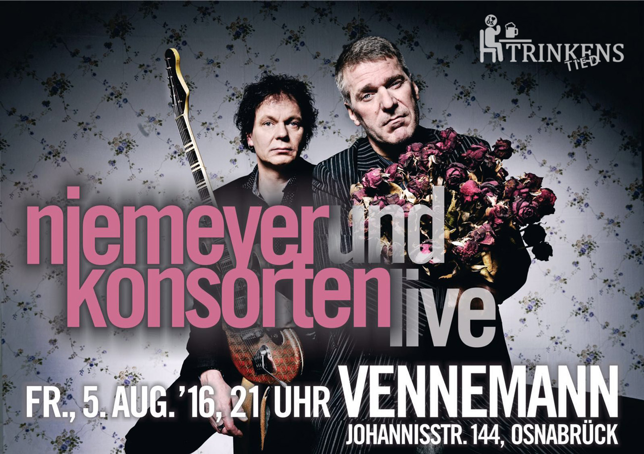 Niemeyer & Konsorten – das sind die Osnabrücker Musiker Wolfgang Niemeyer und Sven Stumpe. Ein halbes Jahr lang haben sich die beiden nach ihren letzten Liveauftritten, unter anderem bei der os1.tv-Talkshow und im „Sonnendeck“, wo sie beim Song Contest den 1. Platz belegten, in den Übungsraum zurückgezogen und ein komplett neues Programm geschrieben.