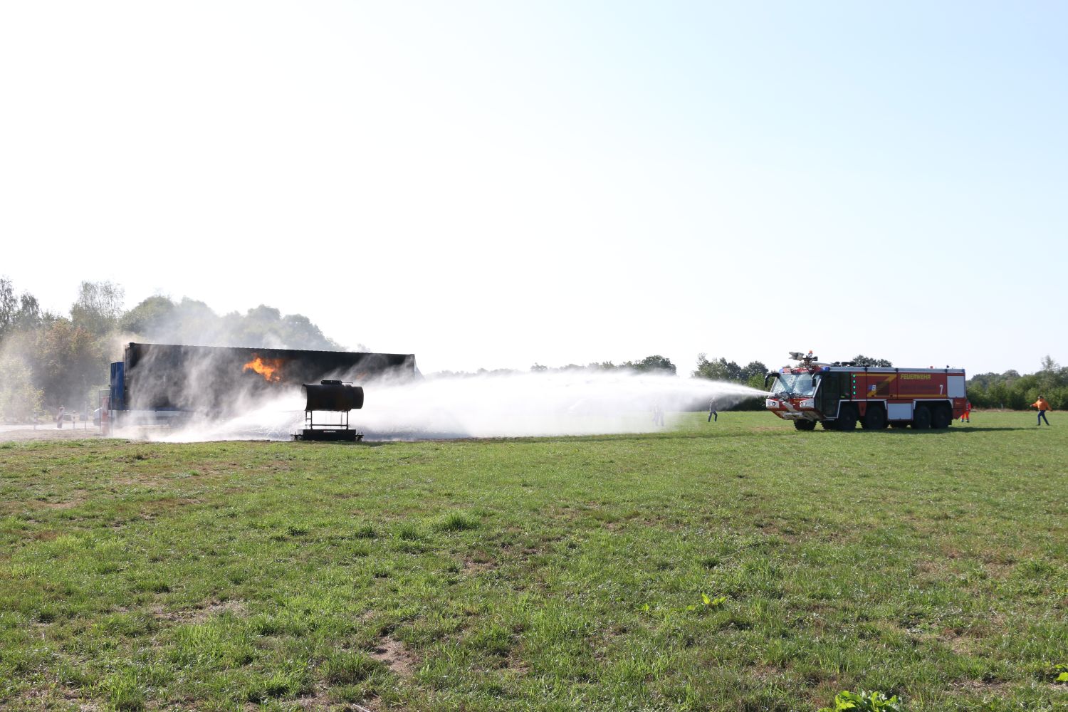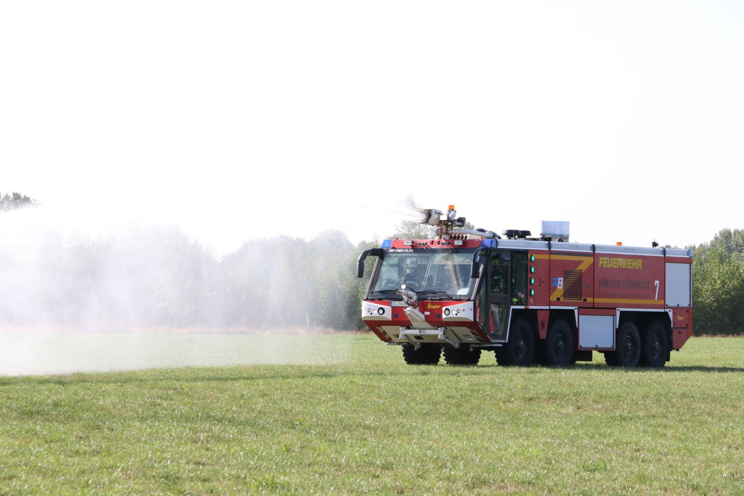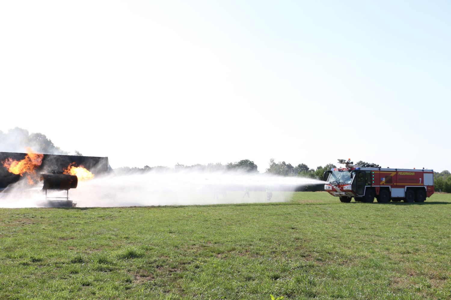 Nur wenige Augenblicke nach dem Sirenenalarm am Flughafen, der zeitgleich auch in die Rettungsleitstelle des Landkreises Steinfurt übermittelt wurde, erreichte ein Flugfeldlöschfahrzeug der Flughafenfeuerwehr das Geschehen. Wie im Realfall hatte dieses die vorrangige Aufgabe, direkt das Feuer zu bekämpfen, damit Passagiere und Verletzte von weiteren Kräften in Sicherheit gebracht werden können.