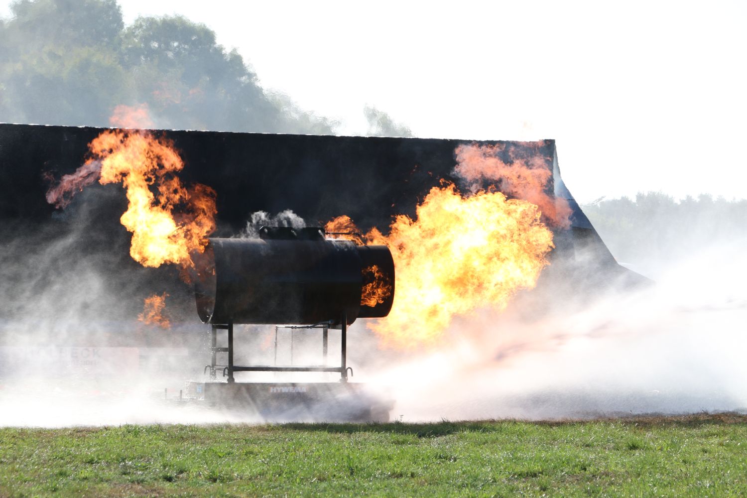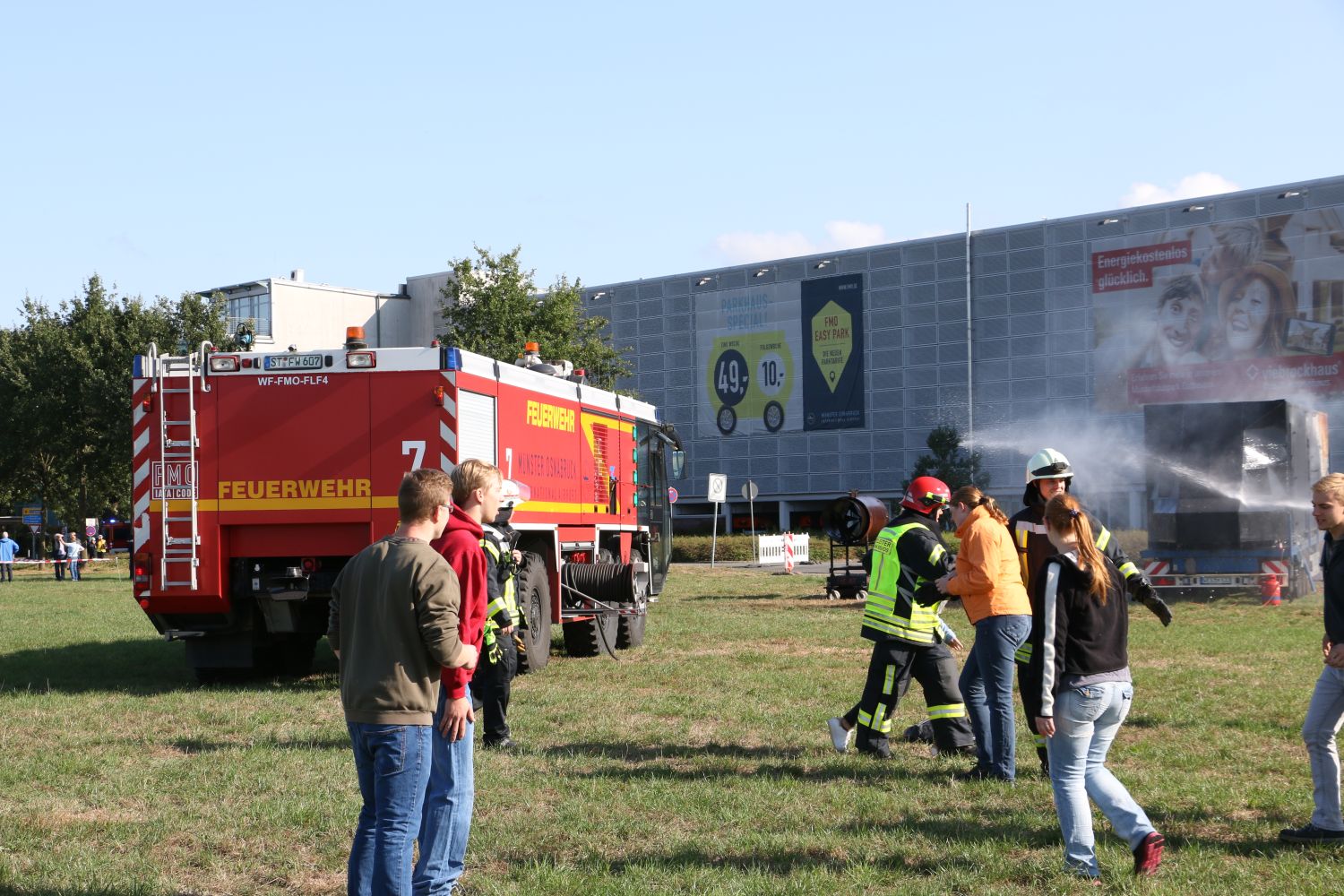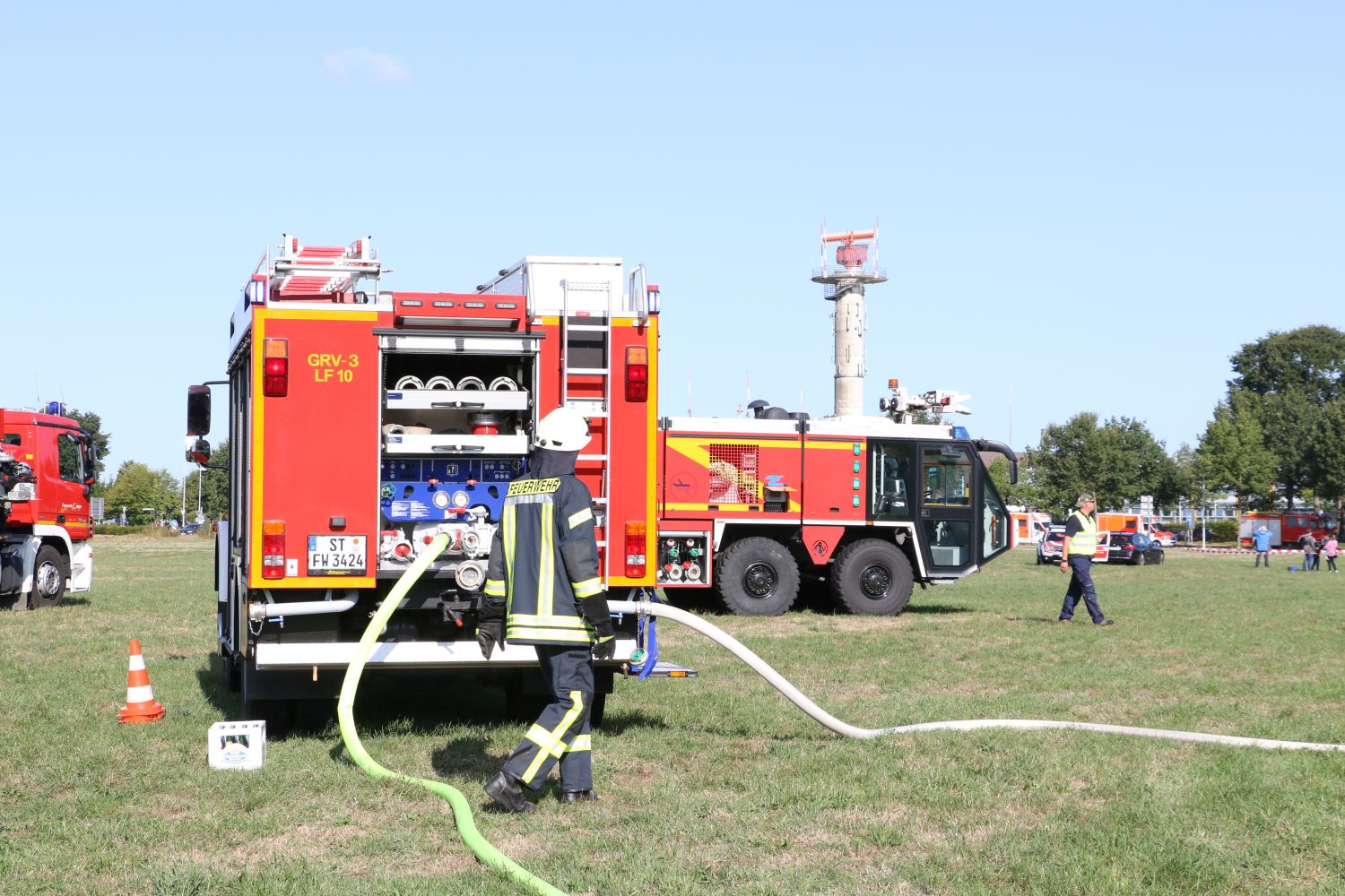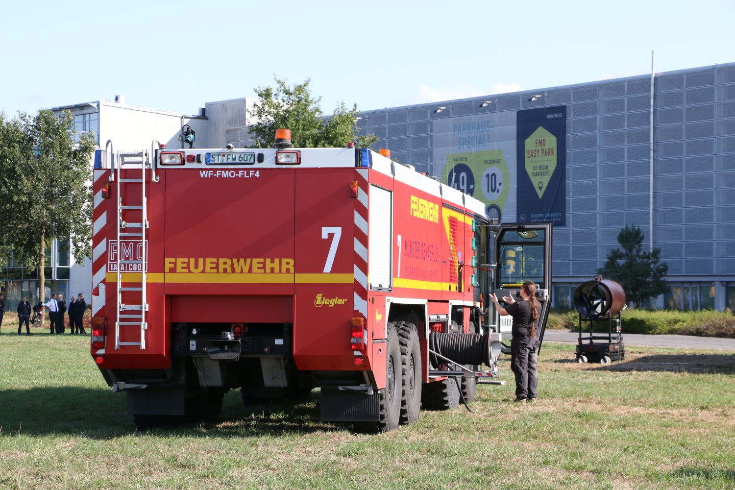 Nur wenige Augenblicke nach dem Sirenenalarm am Flughafen, der zeitgleich auch in die Rettungsleitstelle des Landkreises Steinfurt übermittelt wurde, erreichte ein Flugfeldlöschfahrzeug der Flughafenfeuerwehr das Geschehen. Wie im Realfall hatte dieses die vorrangige Aufgabe, direkt das Feuer zu bekämpfen, damit Passagiere und Verletzte von weiteren Kräften in Sicherheit gebracht werden können.