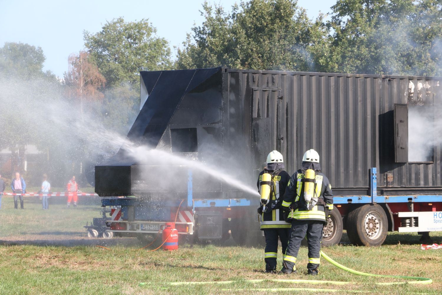 „Unser heutiger Schwerpunkt lag besonders im Bereich Löschen und Retten“, so Dieter Krawietz von der Kreisleitstelle Steinfurt und Mitglied der Vorbereitungsteams dieser Übung. „Im Ernstfall würden wir noch zahlreiche weitere Kräfte einsetzen. Neben mehr Rettungsfahrzeugen zum Abtransport der Verletzten würden wir auch noch eine psychosoziale Betreuung durch Notfallseelsorger anbieten“, führte Krawietz weiter aus und erinnerte an ein wesentliches Jubiläum im der deutschen Notfallversorgung: „Nach dem großen Unglück vor fast genau 30 Jahren bei einer Flugshow in Ramstein wurden in Deutschland überall Teams für die Notfallseelsorge gegründet.“