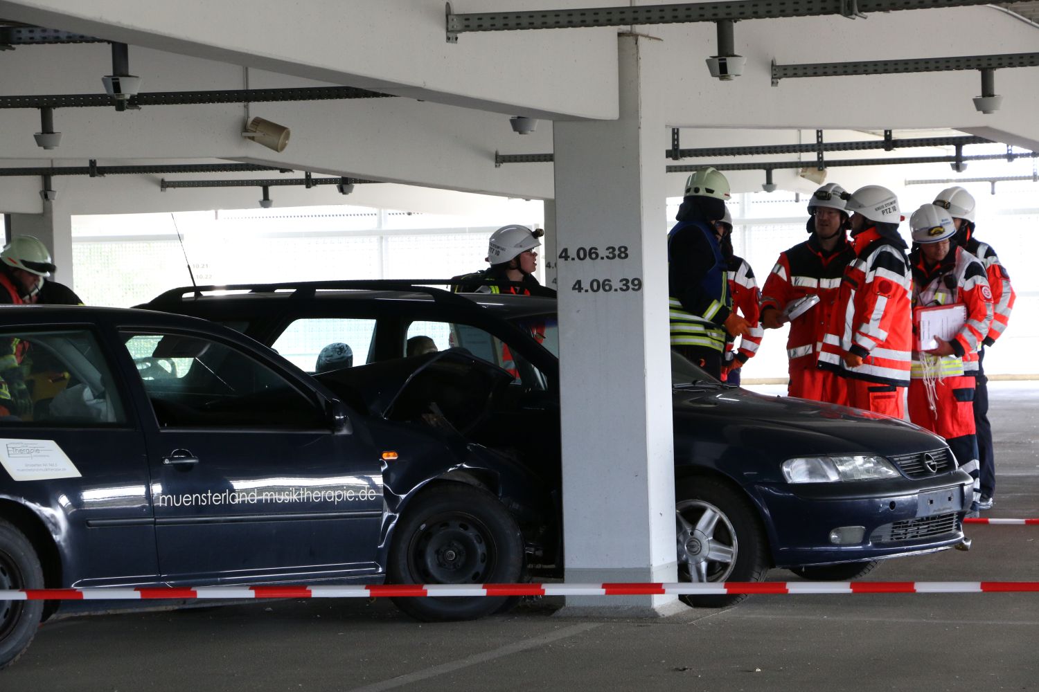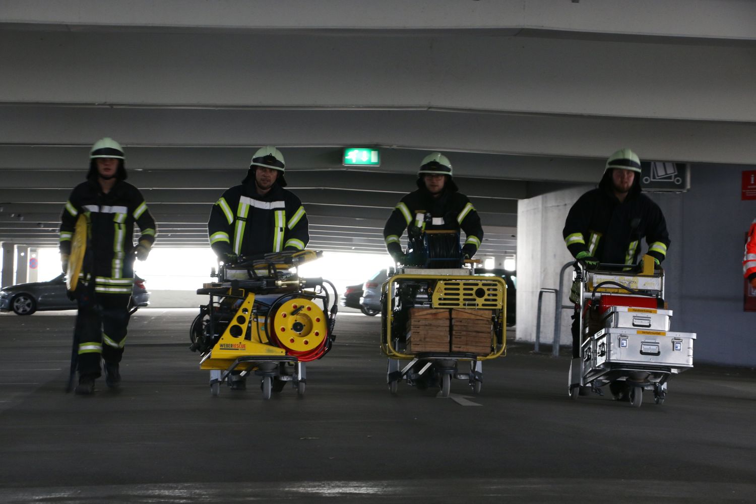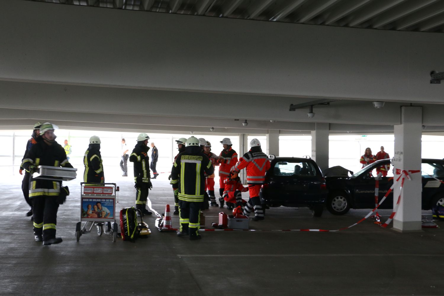 Parallel zu den Maßnahmen auf dem Feld waren bereits Feuerwehrkräfte und Rettungsdienstpersonal am Parkhaus angerückt. Sie bekämpften von einer Drehleiter aus das Feuer und leiteten die Rettungsmaßnahmen zu den beiden Verkehrsunfällen ein. Allerdings ist das Dach des Parkhauses zu niedrig ist, um dort mit großen Rettungswagen und Löschfahrzeugen hineinzufahren. Deswegen mussten die Einsatzkräfte die Werkzeuge zur Rettung der Personen selbst in dem Gebäude hochbringen. Viele Geräte und Materialien wurden getragen oder mit Gepächwagen die Auffahrt hinaufgeschoben.