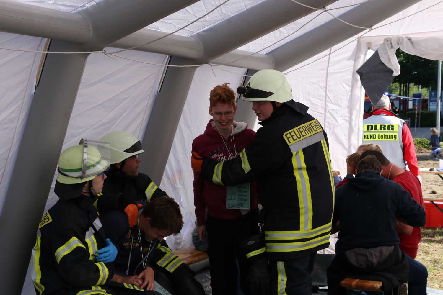 Teilweise „blutüberströmte“ Unfalldarsteller agierten entsprechend den Szenariovorgaben und irrten schreiend über den Übungsplatz, um ein möglichst realistisches Bild der Unfallsituation zu geben. Sie wurden von den Einsatzkräften vor Ort nach Verletzungsgrad gesichtet, erstbehandelt und betreut. Diese Statisten gehörten einer Gruppe für ‚Realistische Unfall- und Notfall-Darstellung‘, kurz RUND, an, welche zur DLRG im Kreis Steinfurt gehört.