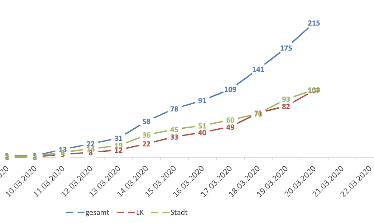 Mit den heute veröffentlichten Daten sind Stadt und Landkreis hinsichtlich der Infektionen (107 bzw. 108) gleichauf, während im Landkreis deutlich mehr Menschen in häuslicher Quarantäne sind (566 zu 298 in der Stadt).