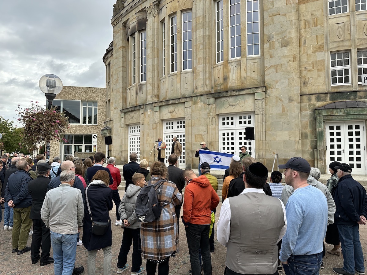 Rund 150 Menschen versammelten sich nach nur sehr kurzer Vorlaufzeit am Sonntagabend vor dem Osnabrücker Theater um ein Zeichen für die Solidarität mit Israel und der jüdischen Gemeinde in Osnabrück zu setzen.