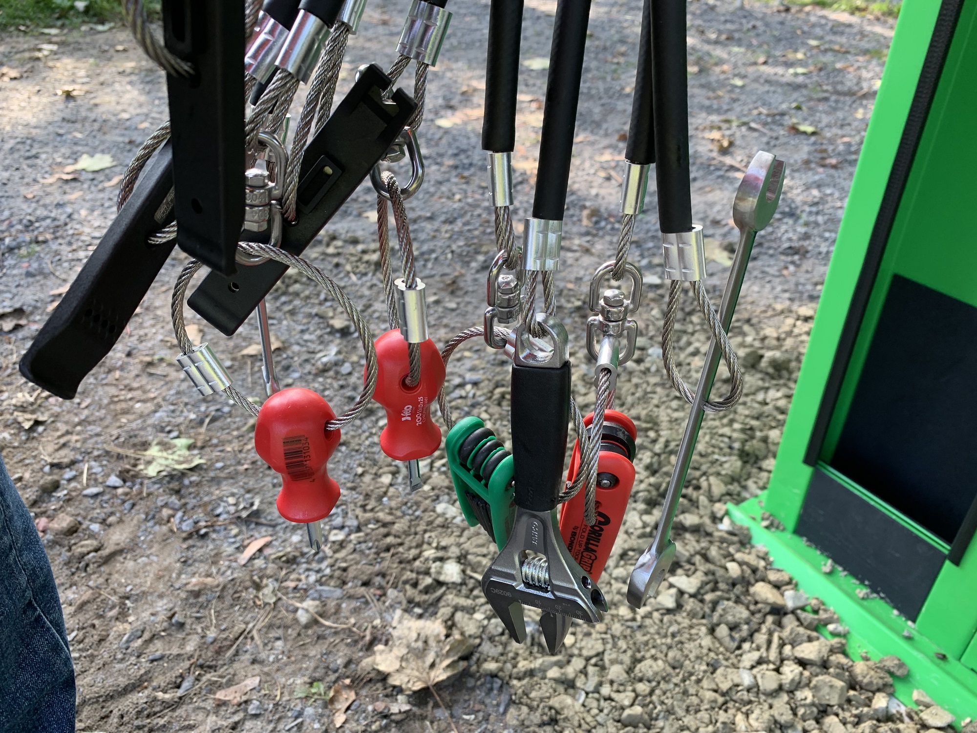 Der an der Station angebrachte Werkzeugsatz mit allen gängigen Tools ist für die meisten Reparaturen perfekt geeignet. An einem Griff kann das Fahrrad aufgehängt werden, so dass Kurbelbewegungen möglich sind. Herzstück des Gerätes ist eine Handpumpe mit einem Druckbereich bis zehn BAR und einem Adapter für alle Ventiltypen.