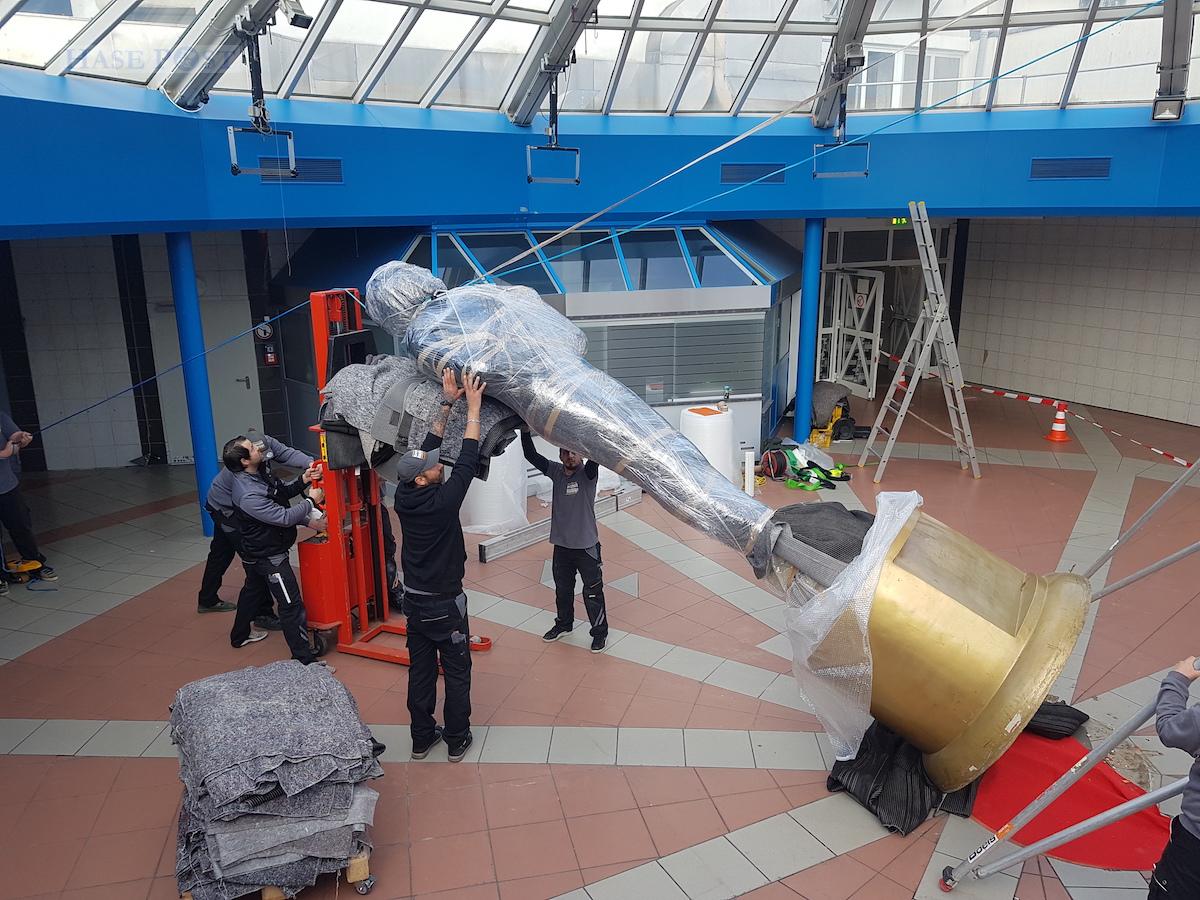 Die goldene und rund 5 Meter hohe Statue, die anders als die Hollywood-Trophäe mit einer Filmrolle in ihren Händen auch optisch eine Verbundenheit zum Film zeigt, ist zwar mit „nur“ 100 Kilo Gesamtgewicht fast schon ein Leichtgewicht, doch die Mitarbeiter der Firma Marschall Umzüge hatten dennoch eine logistische Meisterleistung zu absolvieren. Schließlich sollte das Maskottchen, das seit 2011 seinen Platz an der Johannisstraße hatte, ohne Kratzer an seinen neuen Aufstellort im Foyer der HALL OF FAME gelangen.