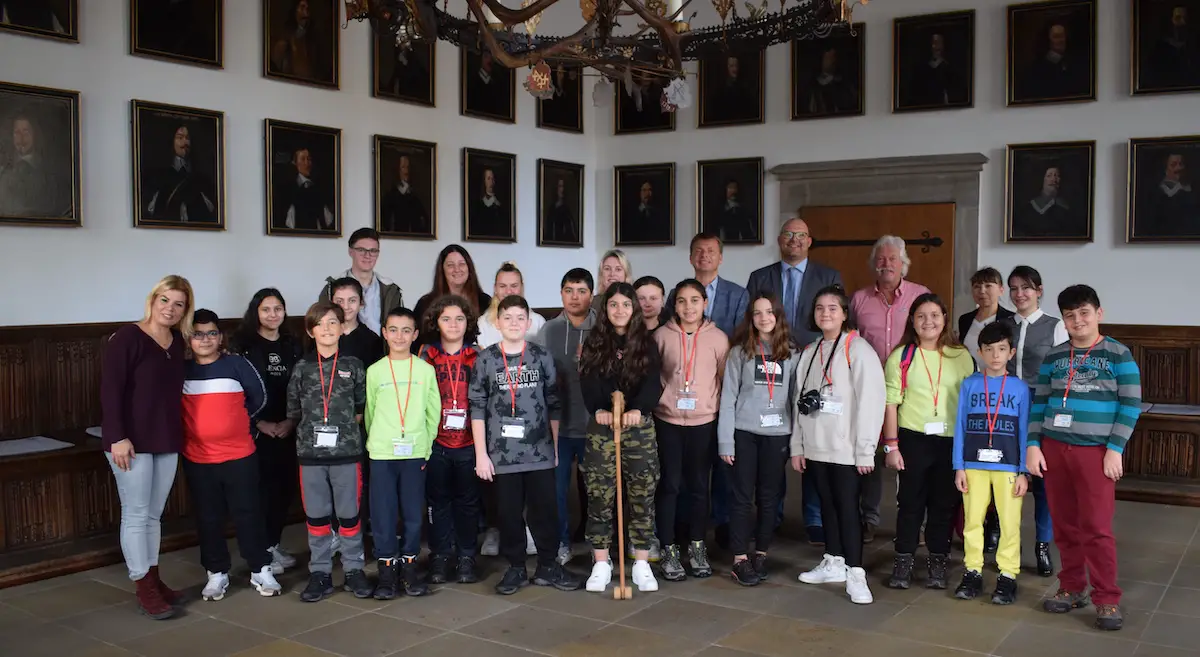Renate Frankenberg von der Rathausinformation erklärte den aufgeregten Kindern die Bedeutung des Friedenssaals und des Steckenpferdreitens: „Das Steckenpferdreiten fand zum ersten Mal im Jahr 1948 statt. Der Zweite Weltkrieg war gerade zu Ende und die Menschen freuten sich über den Frieden, daher griffen sie ein Ereignis auf, welches sich der Legende nach genau 300 Jahre zuvor, nach dem Abschluss des Westfälischen Frieden abgespielt haben soll. Damals ritten Kinder auf Steckenpferden über den Marktplatz und feierten ein Friedensfest. Nach dem Ende des Zweiten Weltkrieges stellte man dieses Ereignis nach und die Tradition des Steckenpferdreitens war geboren:“ Auch Jens Koopmann griff die Geschichte auf und erklärte: „Nur ein Kompromiss konnte den 30-Jährigen Krieg beenden. Aufeinander zugehen, miteinander reden, ein offener und vorurteilsfreier Umgang sind auch in der heutigen Zeit wichtig, so gelingt es uns die Fehler der Geschichte nicht zu wiederholen. Tauscht euch daher mit euren Gastfamilien und Mitschülern aus und nehmt viele neue Eindrücke mit nach Hause.“
