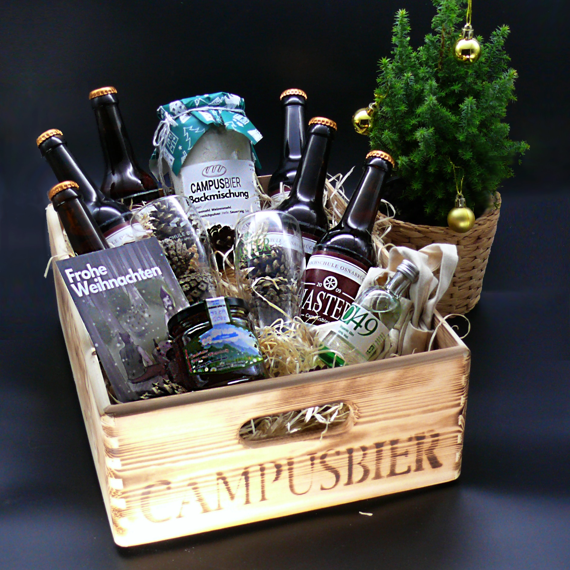 Bei der Konzeption haben die Studierenden neben den kulinarischen Produkten auf weitere Dinge Wert gelegt: „Wir wollten zum einen das Thema Weihnachten aufgreifen und zum anderen einen Bezug zu Osnabrück herstellen. Deswegen haben wir die beiden Weihnachtsgeschichten mit in die Boxen aufgenommen“, erklärt Paul Frank, Bachelor Wirtschaftsingenieurswesen Agrar/Lebensmittel und Team-Mitglied des Campusbierteams. Verpackt ist das Ganze in geflammten Holzkisten.
