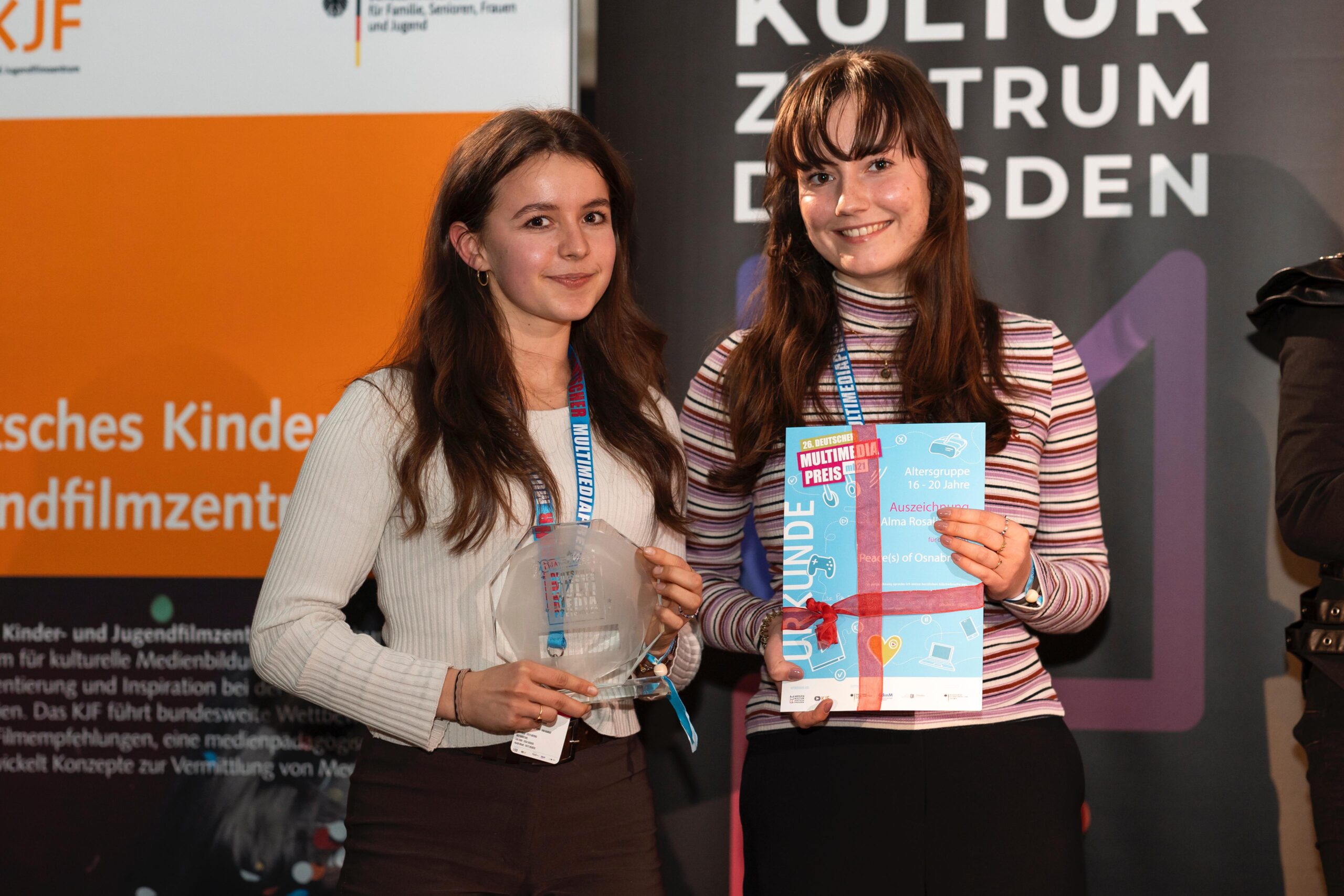 Luise Friedrich und Alma Kühl, die beide 2024 ihr Abitur im Gymnasium „In der Wüste“ gemacht haben, wurden kürzlich in Dresden im Rahmen des Deutschen Multimediapreises für ihren Podcast „peace(s) of osnabrück“ ausgezeichnet.