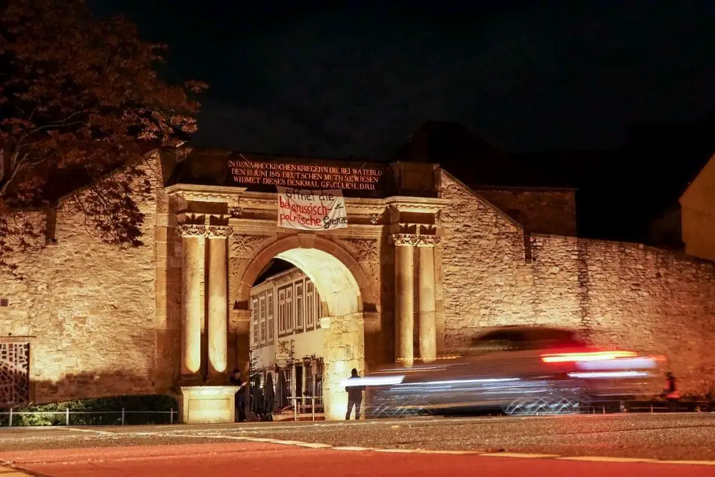 Die Situation an der Grenze zwischen Polen und Belraus spitzt sich seit Wochen zu. Einige der Migratinnen und Migraten wurden inzwischen ausgeflogen und in ihre Heimatländer zurückgebracht. Doch für viele ist noch nicht klar, wie es weitergeht. Die Osnabrücker Seebrücke fordert die Öffnung der Grenze und hängte dafür am Montagabend (22. November) ein Plakat am Heger Tor auf.