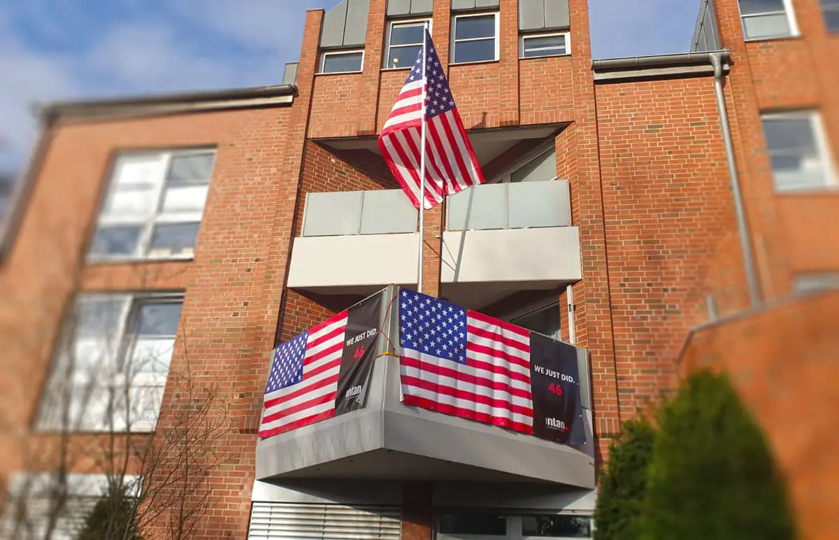Das Osnabrücker Unternehmen intan media services am Blumenhaller Weg begrüßt den US-Präsidenten mit einer Stars and Stripes Flagge, sowie einem Banner auf dem mit „WE JUST DID. 46“ das inoffizielle Motto der Amtseinführungsfeierlichkeiten zu lesen ist.