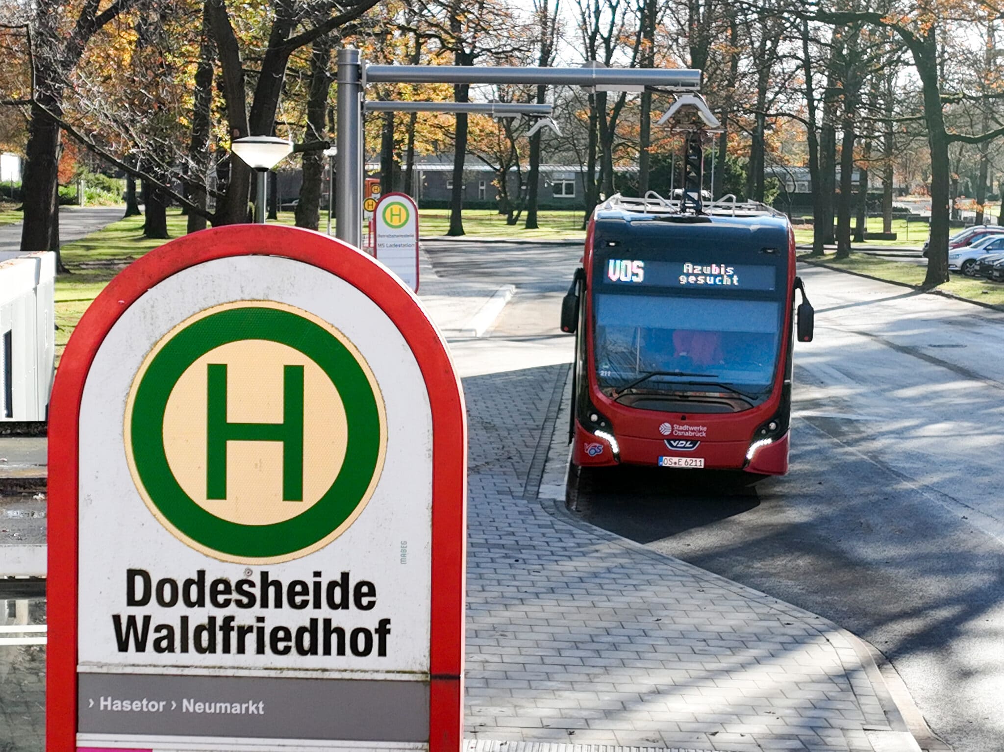 Mit der Linie M5 (Dodesheide – Kreishaus/Zoo) haben die Stadtwerke die vierte der fünf MetroBus-Linien auf kompletten E-Betrieb umgestellt. Der Umbau der Endwende am Waldfriedhof Dodesheide mitsamt Ladestation ist bis auf kleinere Restarbeiten abgeschlossen. Auf der M5 kommen somit zehn weitere E-Gelenkbusse zum Einsatz.