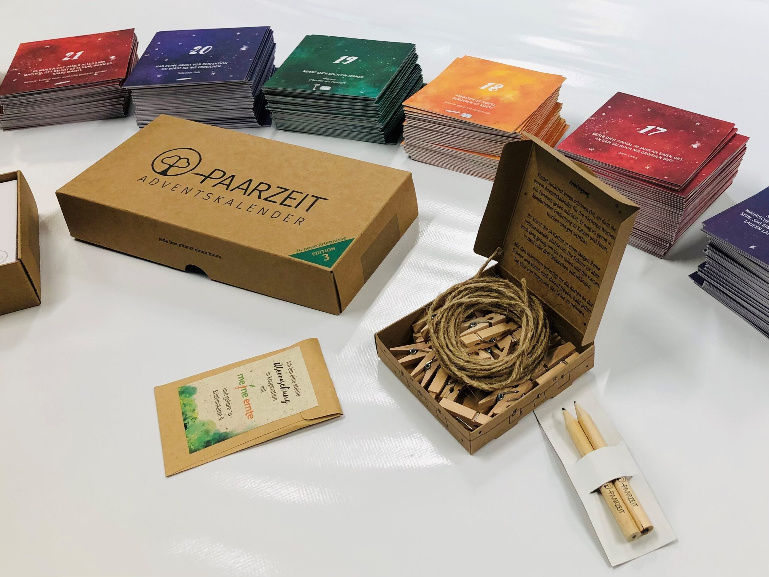 Der Paarzeit-Adventskalender ist gefüllt mit 24 Erlebnissen für die Liebe. Die Idee ist aus dem Wunsch nach mehr Zweisamkeit und guten Gesprächen entstanden. Für die beiden Entwickler Alexander Franksmann und Thorben Humann war es ebenfalls wichtig, dass der Adventskalender nachhaltig ist.