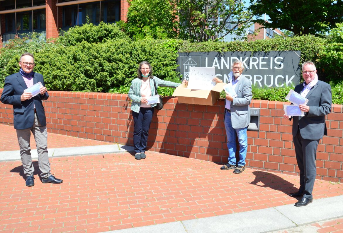 Zoogeschäftsführer Andreas Busemann freut sich über die großzügige Spende von 2.400 Litern Desinfektionsmittel, die Guido Blum, Geschäftsführender Gesellschafter und Florian Schwentker, Prokurist und Vertriebsleiter der Firma German-Oecotec überreichten. / Foto: Zoo Osnabrück, Marilena Koch.