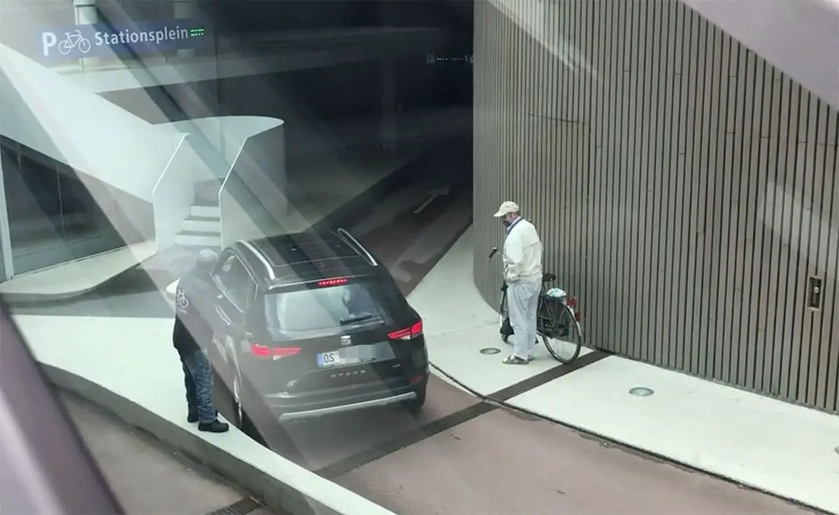 Die Fahrradgarage in Utrecht ist die weltgrößte ihrer Art. Für mehr als 12.500 Fahrräder gibt es Abstellplätze – für Autos ist sie nicht vorgesehen. Ein Osnabrücker SUV-Fahrer hat das allerdings nicht so ganz verstanden: Er fuhr mit seinem Auto geradewegs in die Einfahrt der Garage.