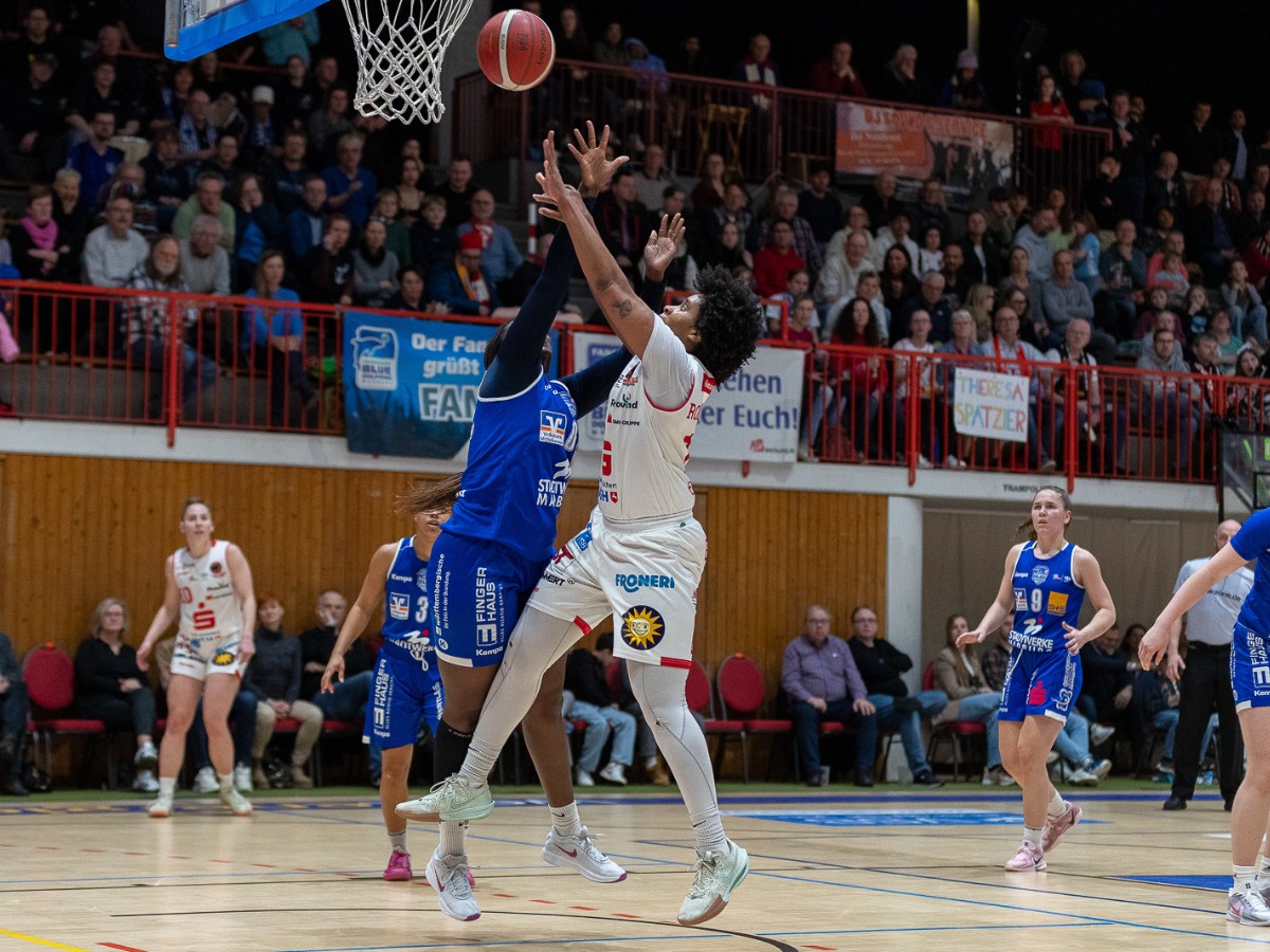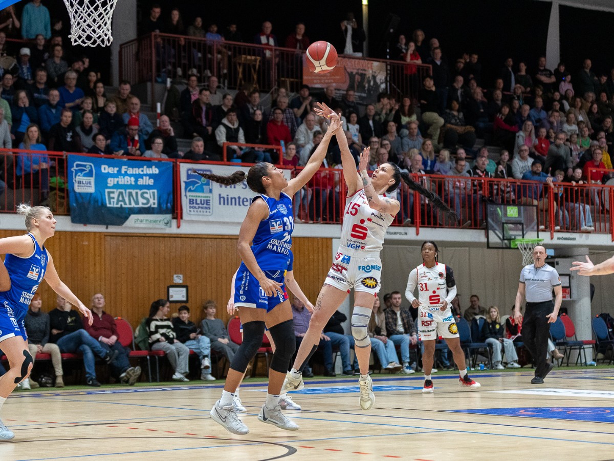 Nach einem knappen ersten Viertel mit einer 18:17-Führung für die Gastgeberinnen wurde das Spiel zunehmend körperlicher. Die Panthers nutzten dies zu ihrem Vorteil und konnten sich phasenweise absetzen, doch Marburg hielt stark dagegen. Ein Timeout bei 32:26 (5:45 Restspielzeit) sollte für neue Impulse sorgen, doch wenig später musste Marburgs Hailey Leidel verletzt das Spielfeld verlassen. Trotz eines weiteren Timeouts der Panthers (40:31, 1:04 Restspielzeit) behaupteten sie ihre Führung zur Halbzeitpause mit 41:34.