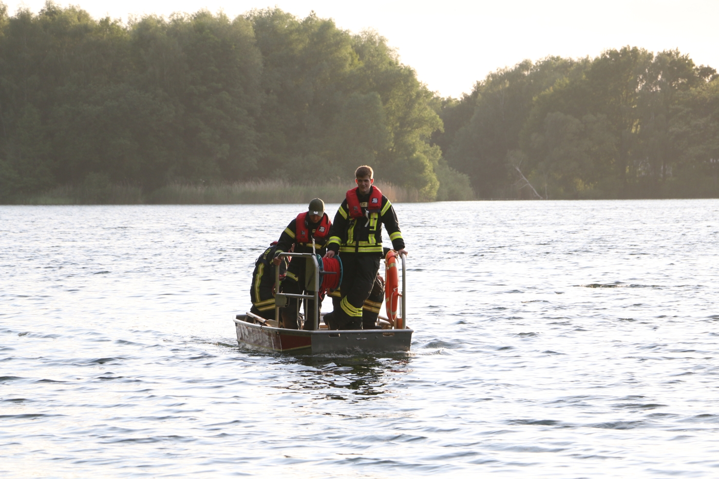 Die Feuerwehr leitete daraufhin eine umfangreiche Suchaktion ein. Mit dem eigenen Boot konnte die Ortsfeuerwehr Schwagstorf direkt auf dem Wasser starten. Umgehend wurde auch die Ortsfeuerwehr Ostercappeln nachalarmiert, um mit ausreichend Personal auch die Uferbereiche intensiv abzusuchen. Auch die Wasserrettungsgruppe der Feuerwehr Bramsche wurde alarmiert. Sie unterstützte die Suche mit zwei weiteren Booten und mehreren Tauchern. Die Polizei befragte parallel Personen die sich am See aufhielten und versuchte herauszufinden, wem das gefundene Surfbrett gehört.