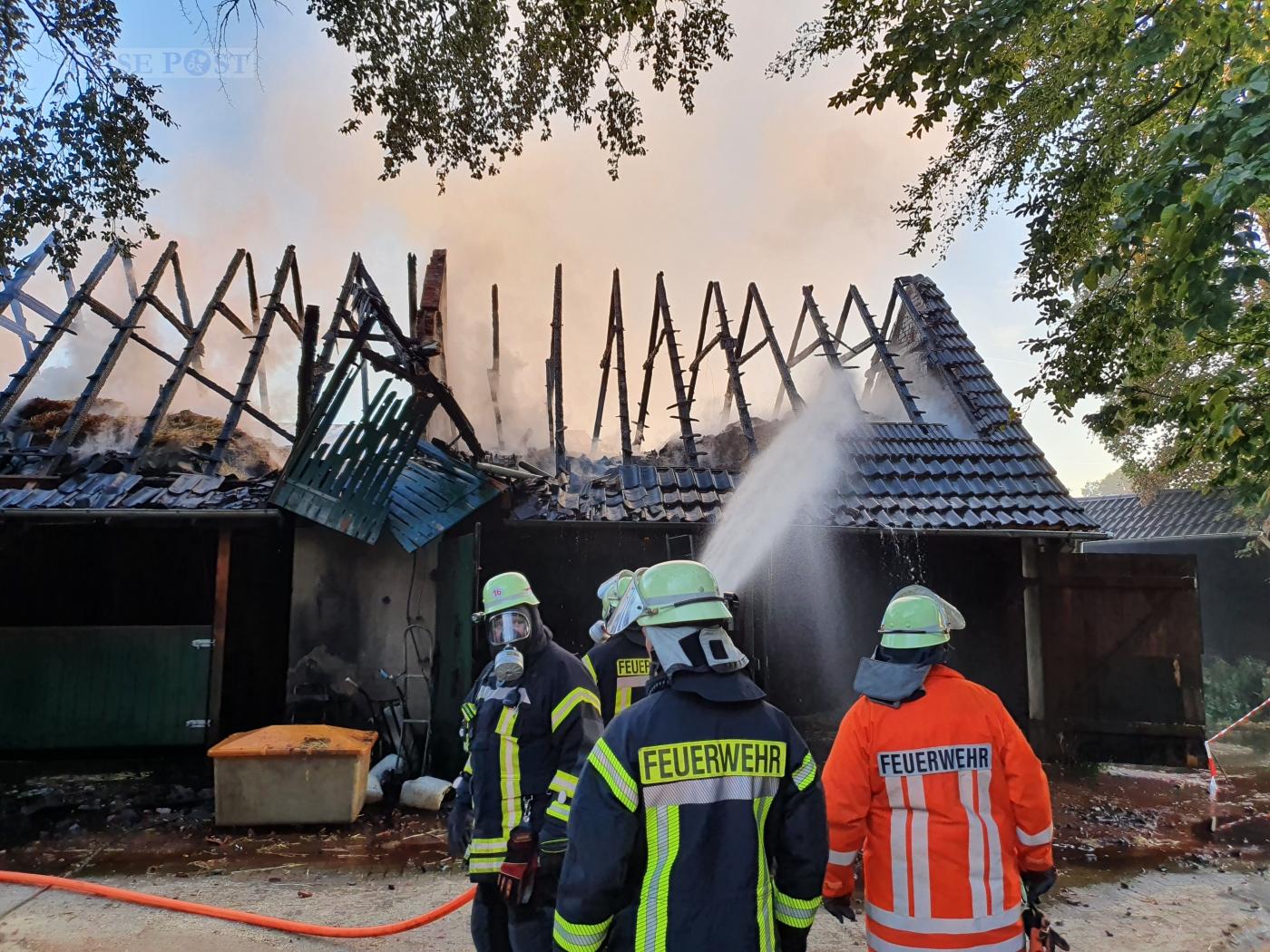Anwohner bemerkten den Brand am Mittwochabend (21.09.2022) während ihrer Hofarbeiten. Dennoch konnte das Gebäude nicht mehr gerettet werden. Die Feuerwehr konnte mit ihrem Einsatz aber die Ausbreitung auf Nachbargebäude verhindern. Die Pferde waren nicht in Gefahr, sie standen bereits in einem Auslauf.