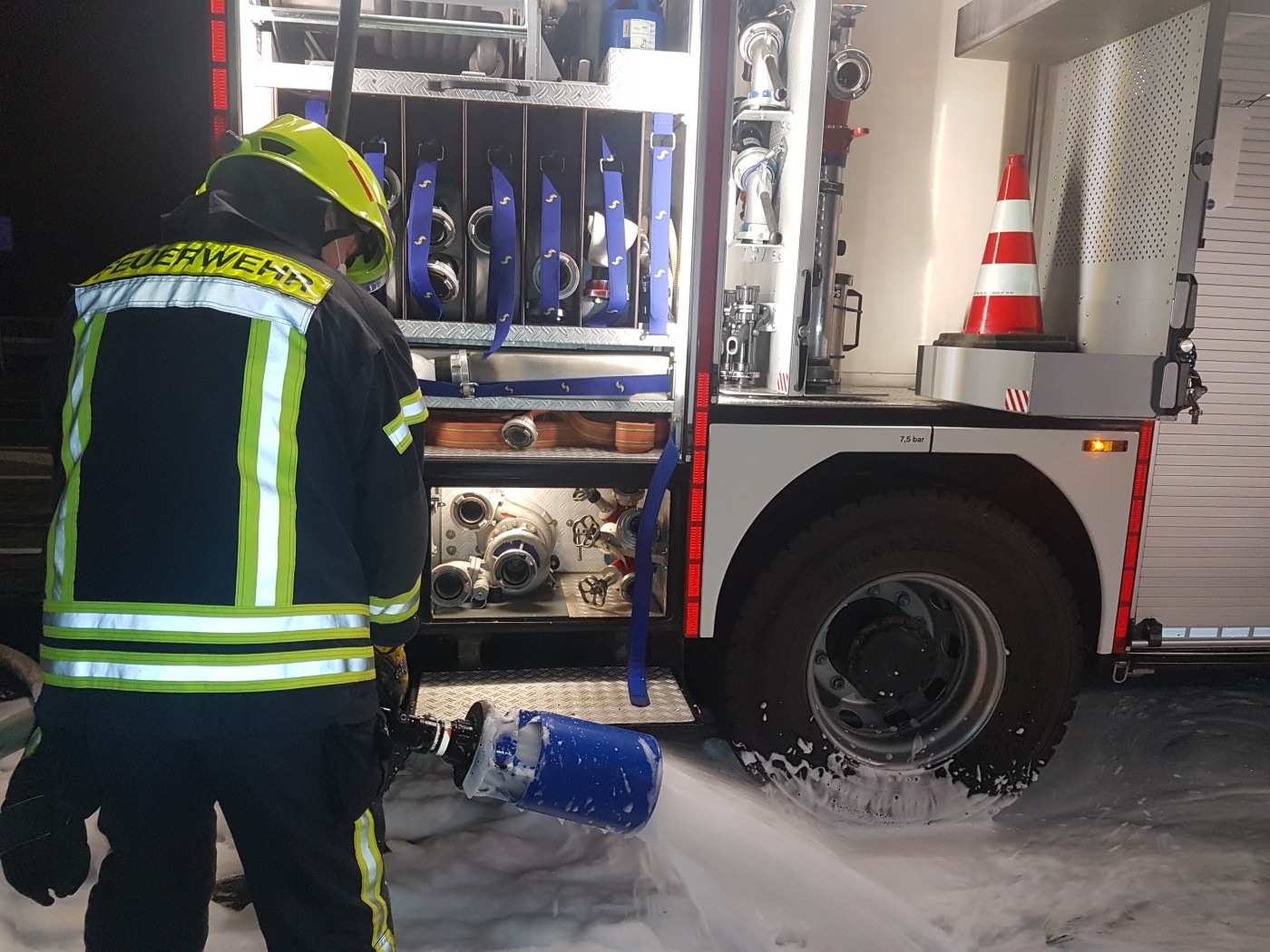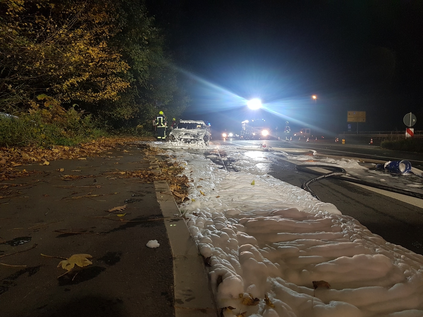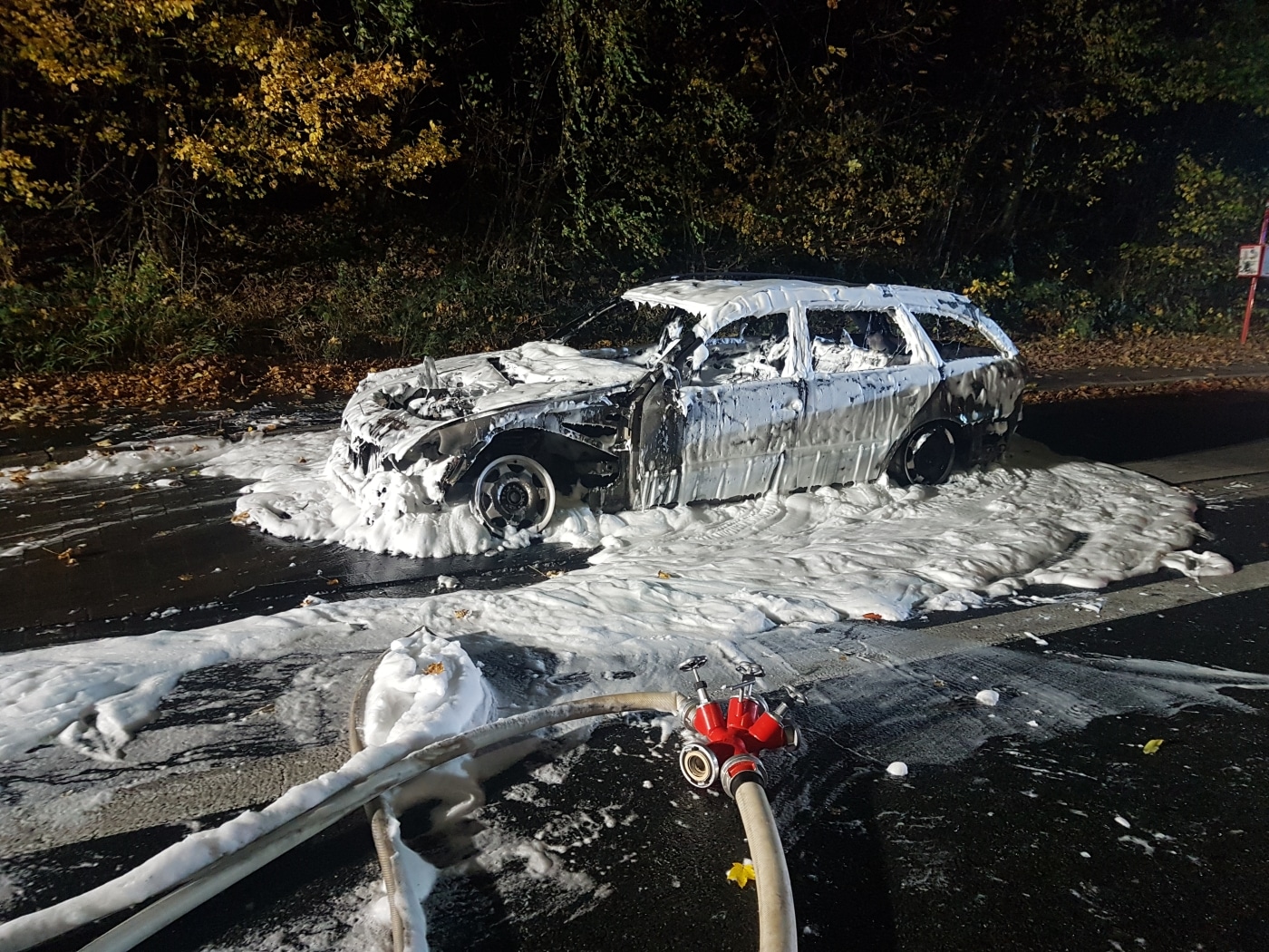 „Als wir ankamen, stand das Auto bereits in Vollbrand.“ berichtete uns Axel Schäfer, Einsatzleiter der Feuerwehr. Er und seine Mannschaft setzten zunächst Wasser ein, bis das Feuer unter Kontrolle war. Anschließend wurde der Brand mit Schaum final abgelöscht.