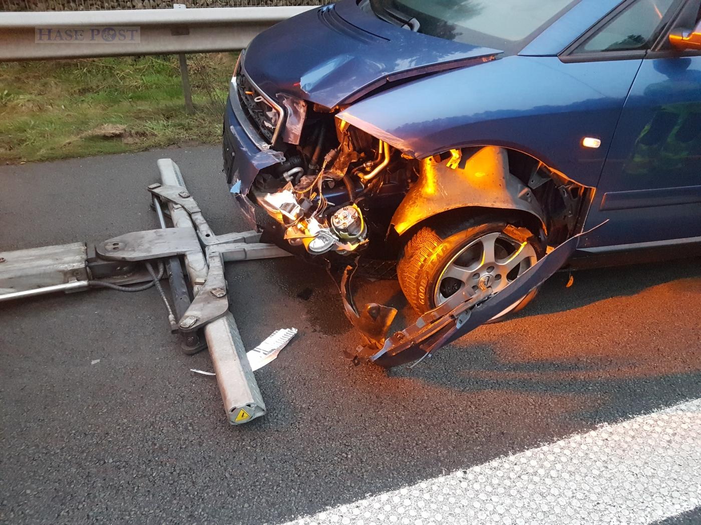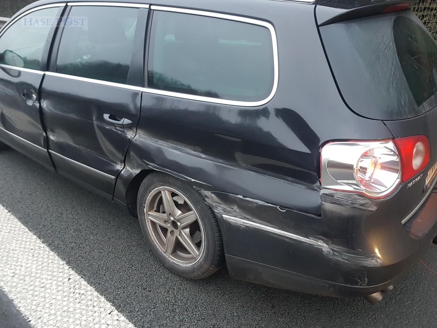 Gegen 16:00 Uhr war ein VW Passat mit einem Autotrailer hinter der Anschlussstelle Osnabrück-Nord in Fahrtrichtung Bremen unterwegs. Kurz vor der Ausfahrt Bramsche verlor der Fahrer die Kontrolle über das Gespann. Er fuhr gegen die rechte und die linke Leitplanke und der Anhänger löste sich vom Zugfahrzeug. Ein geladener Audi A2 rutschte vom Anhänger und blieb quer auf den Fahrspuren stehen.