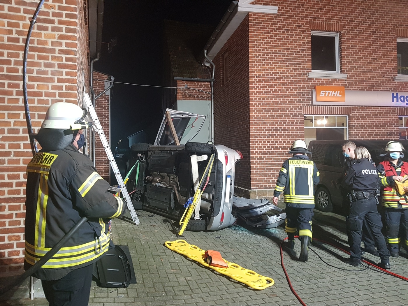 Um 6:50 Uhr wurden Feuerwehr, Rettungsdienst und Polizei zu dem Verkehrsunfall in Bad Iburg alarmiert, bei dem ein Auto auf der Seite lag.