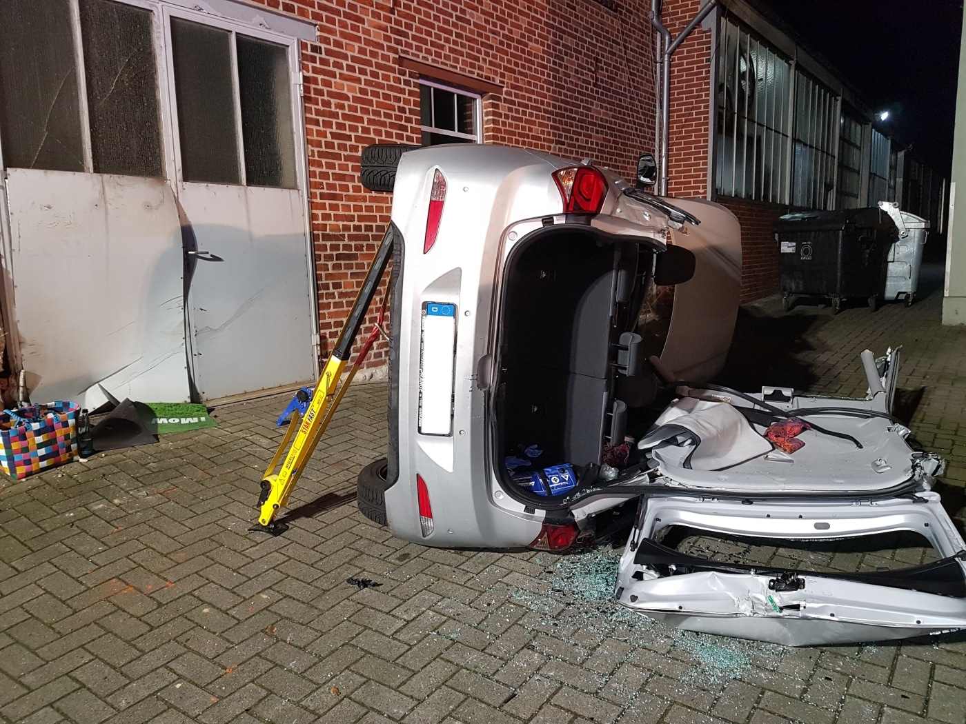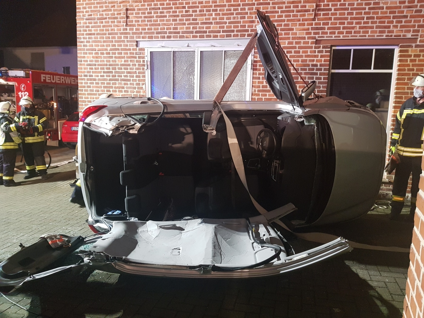 Die Fahrerin des Hyundai versuchte daraufhin auszuweichen und verlor dabei die Kontrolle über ihr Fahrzeug. Sie schleuderte in einer Hofeinfahrt gehen ein Hallentor und kippte mit dem PKW um.