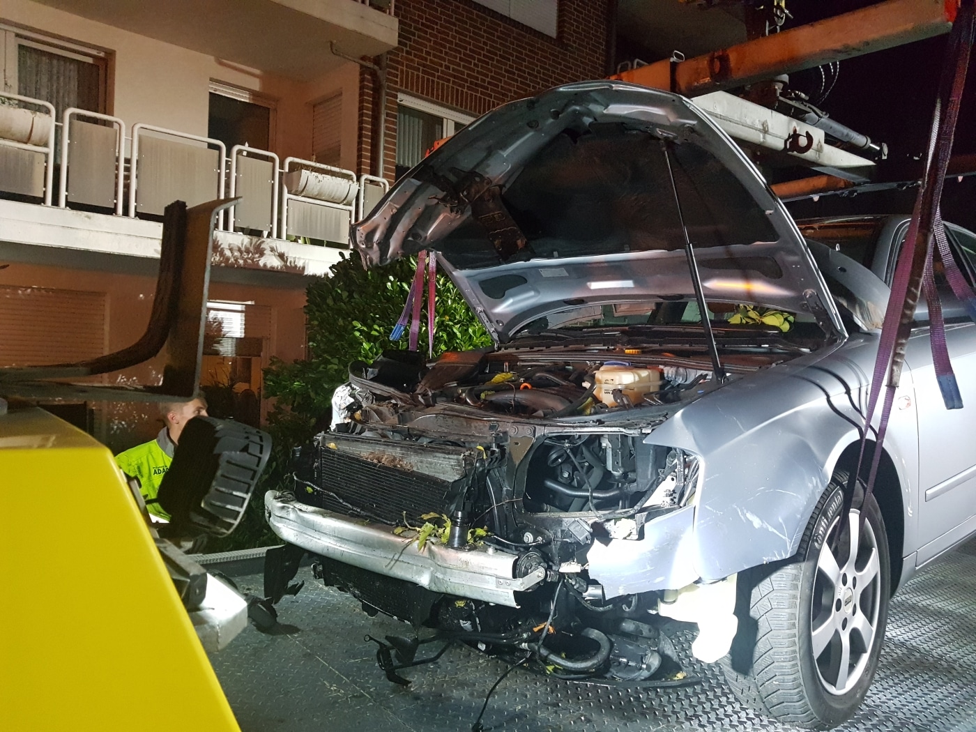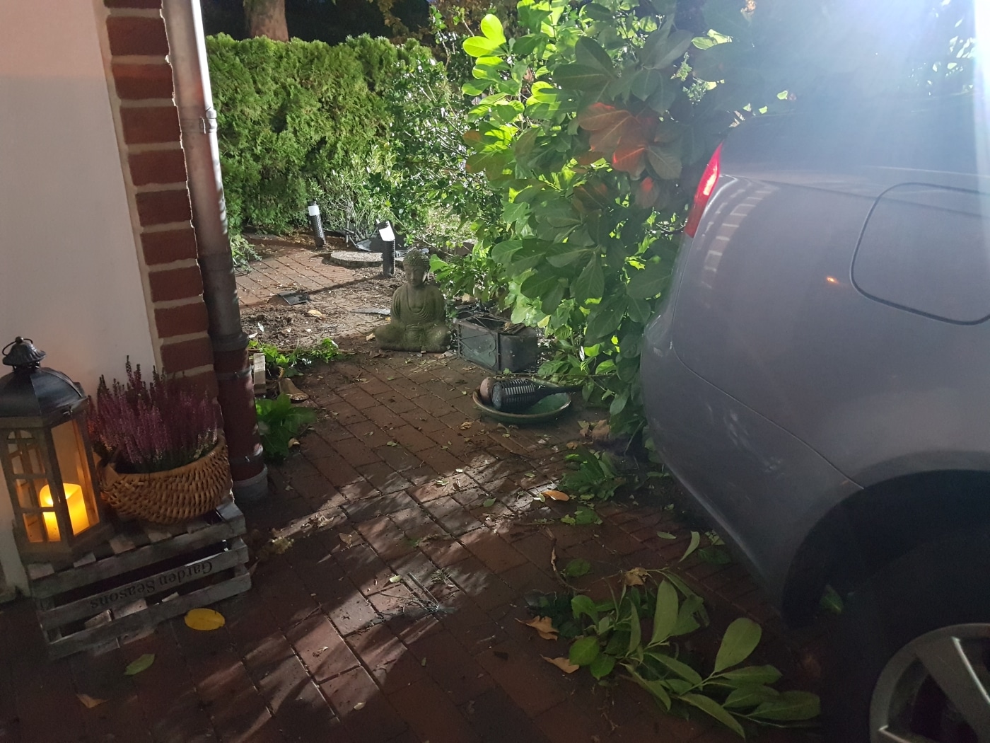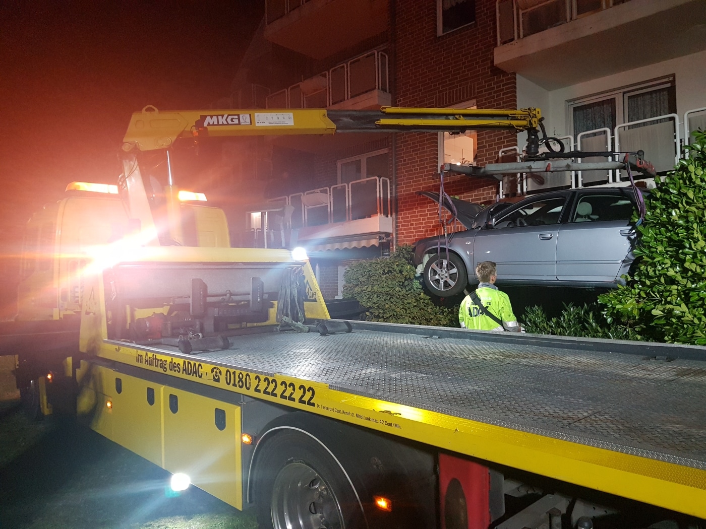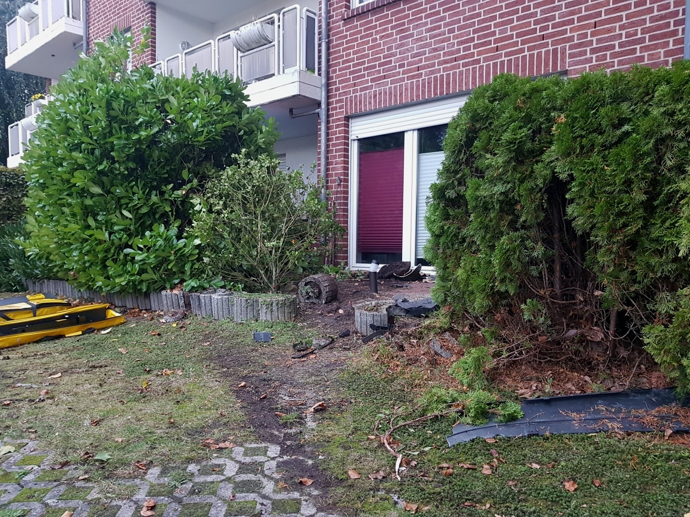 Während am Fahrzeug ein deutlicher Sachschaden entstand, blieben Haus und Terrassenmobiliar weitestgehend verschont. Lediglich ein paar Sträucher, Beete und Blumentöpfe hatte das Fahrzeug überfahren und zerstört. Anwohner und Einsatzkräfte waren erstaunt über dieses spezielle Bild. Einige Bewohner des Mehrfamilienhauses hatten den Knall des Unfalls zunächst mit Umzugstätigkeiten in Verbindung gebracht, bis sie auf den Unfall aufmerksam wurden.