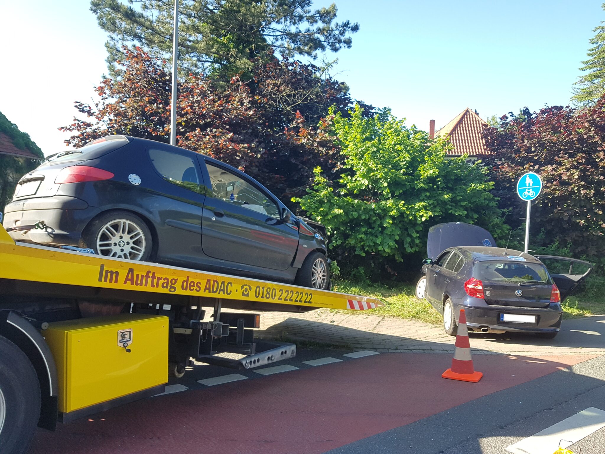 Um 17:23 Uhr wurden Rettungskräfte und Polizei zuerst zum Unfall der beiden Autos gerufen. Eine Frau wollte mit ihrem BMW im Kurvenbereich die Wissinger Straße in Richtung Lyrastraße queren. Dabei übersah sie einen herannahenden Peugeot aus Richtung Ortsmitte. Die Fahrzeuge kollidierten frontseitig und kamen beide von der Fahrbahn ab.