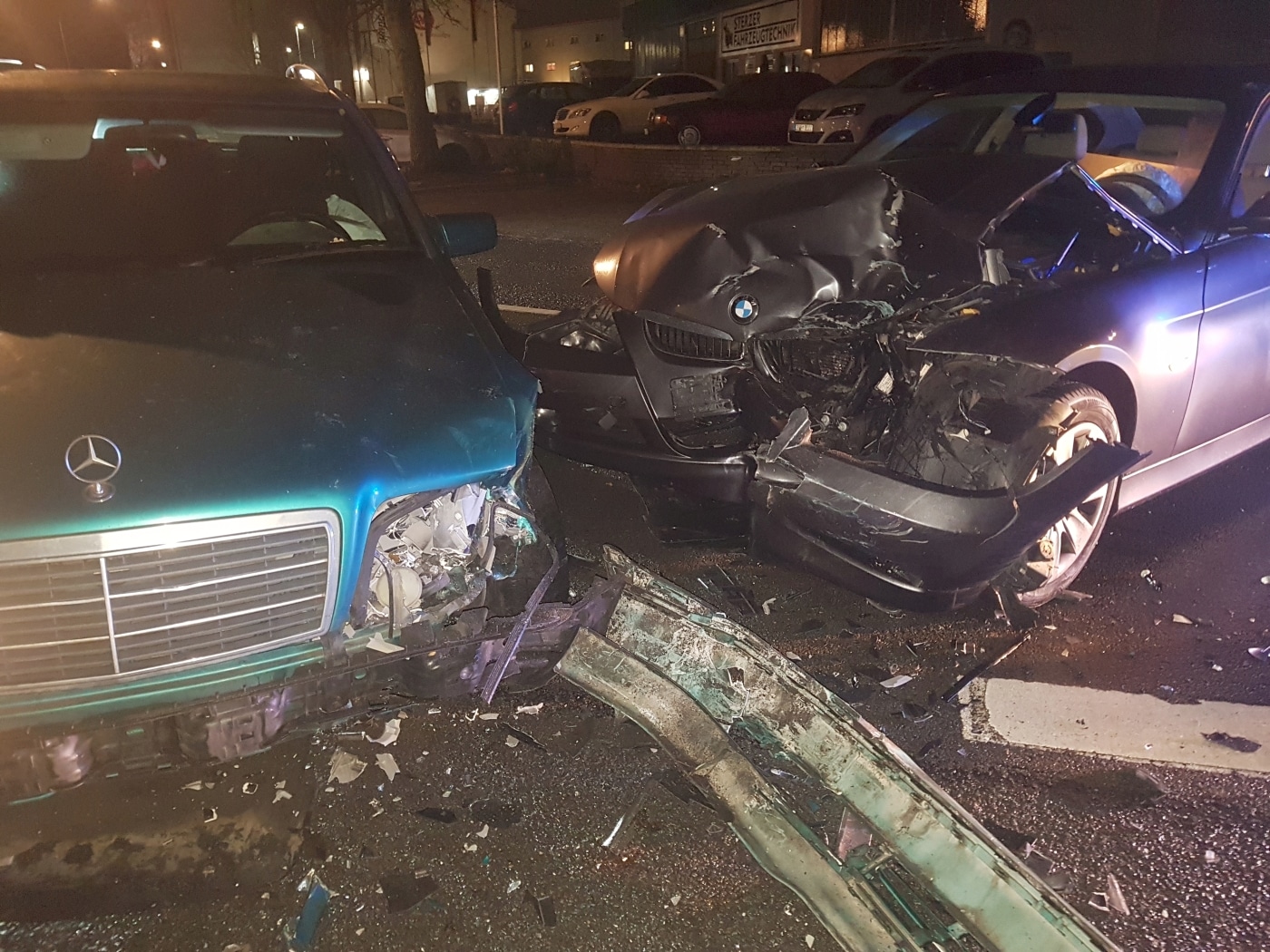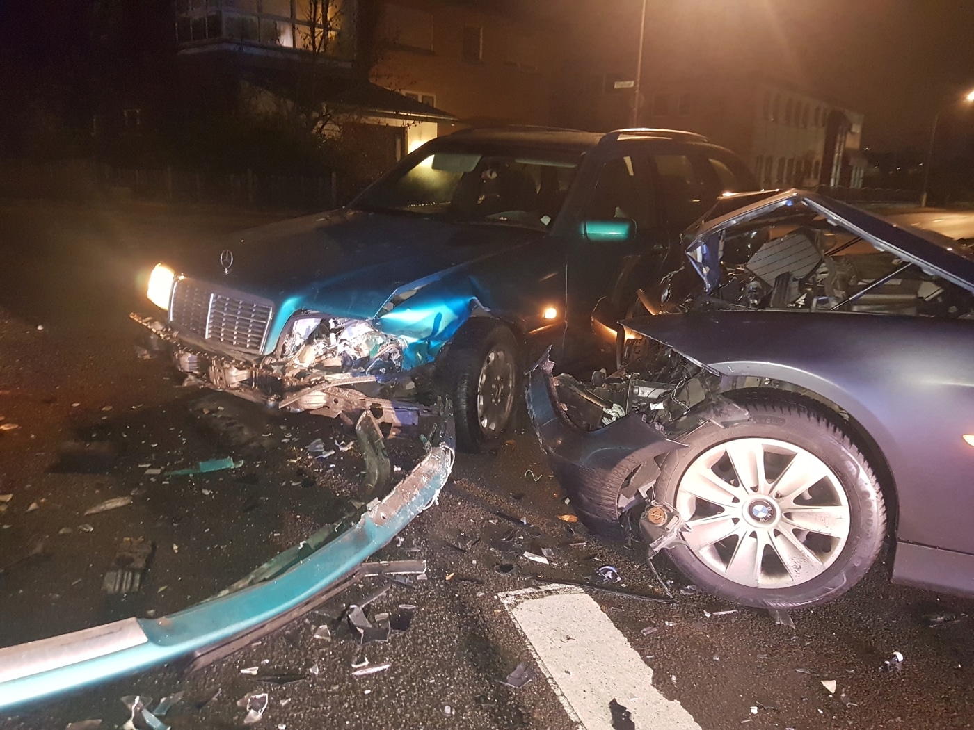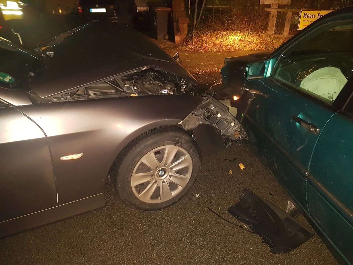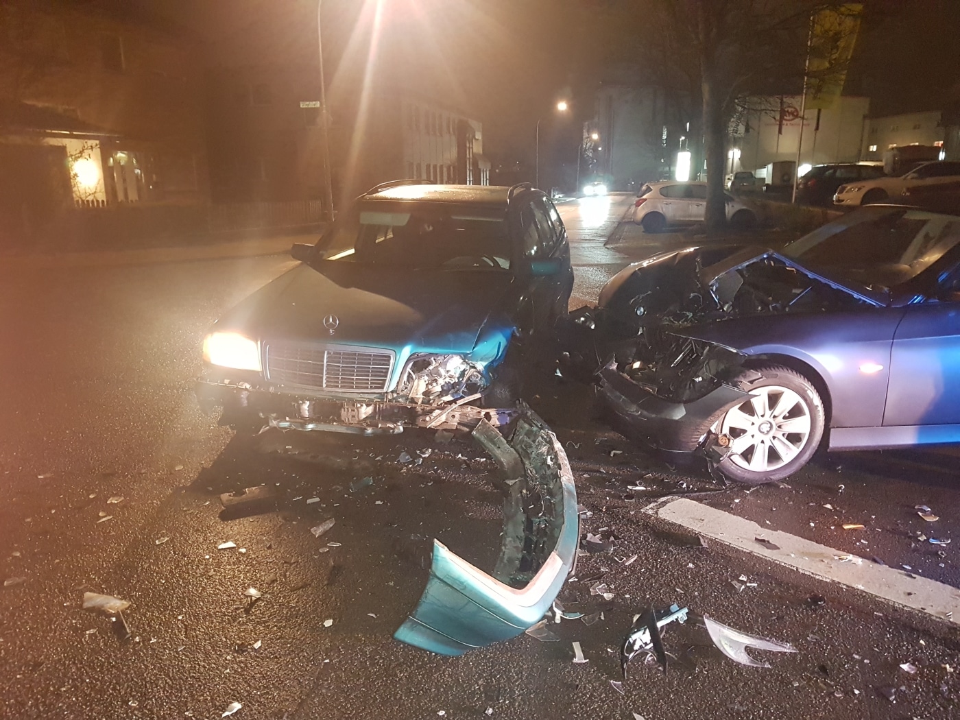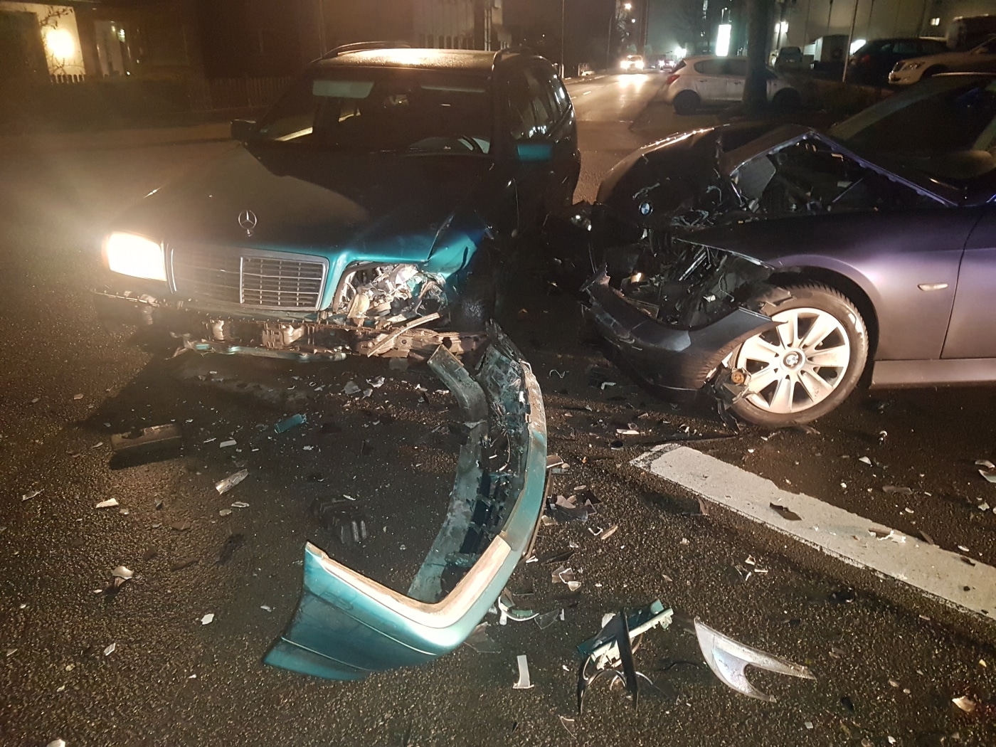Gegen 19:00 Uhr wurden Rettungsdienst und Polizei gerufen. In der abknickenden Vorfahrt zu einem Abzweig der Industriestraße waren sich eine BMW Limousine und ein Mercedes Kombi entgegengekommen. Der BMW geriet dann auf die Gegenfahrbahn und stieß mit der Front gegen die linke vordere Fahrzeugecke des Mercedes.